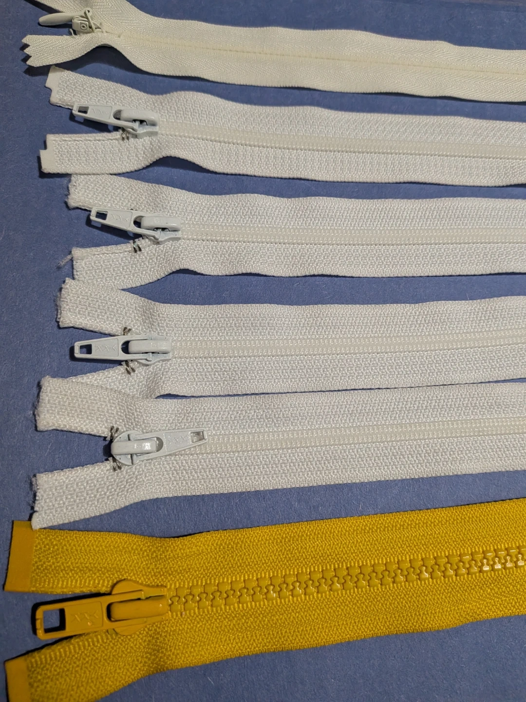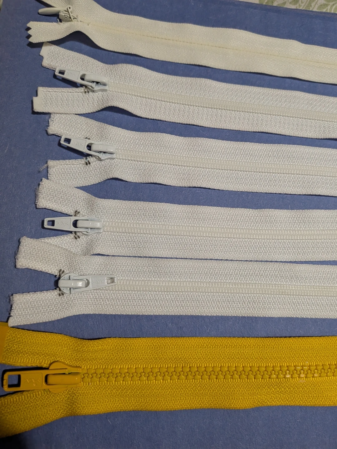 Selling a set of six zippers in various sizes and colours! There are four white zippers, one cream white and one yellow zipper. Perfect for your sewing projects or repairs!
