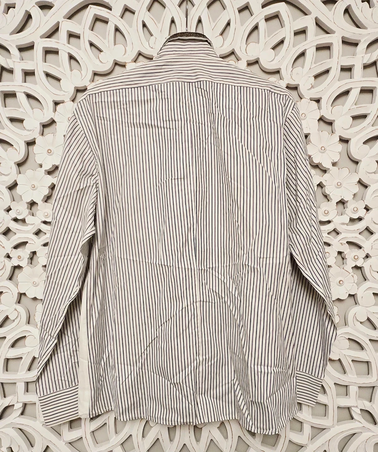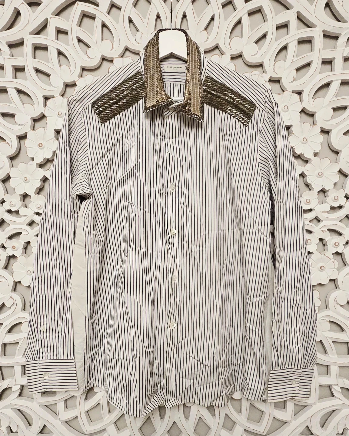 Here's a Dries Van Noten striped shirt with unique embellishments on the collar and shoulders. It's a stylish piece that adds a touch of sophistication to any outfit. The shirt features a classic striped pattern and eye-catching detailing, making it a standout item in your wardrobe.