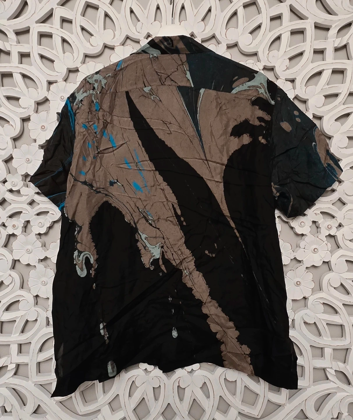 This is a Dries Van Noten shirt, size 52. It features a unique abstract design in shades of black, brown, and blue.