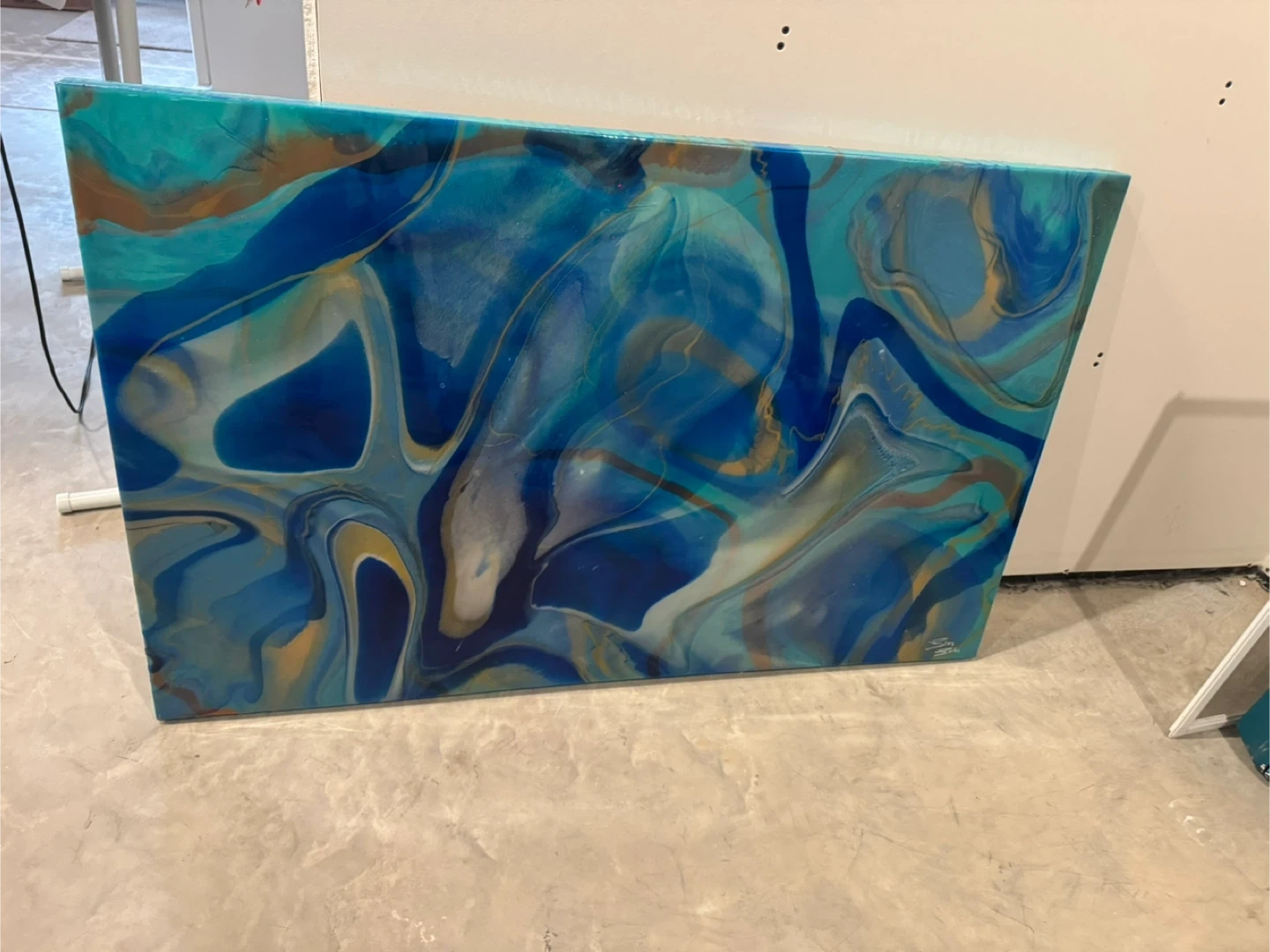 Unique abstract painting with beautiful fluid art design in shades of blue and gold. This piece would look great in any room adding a touch of modern art to your space