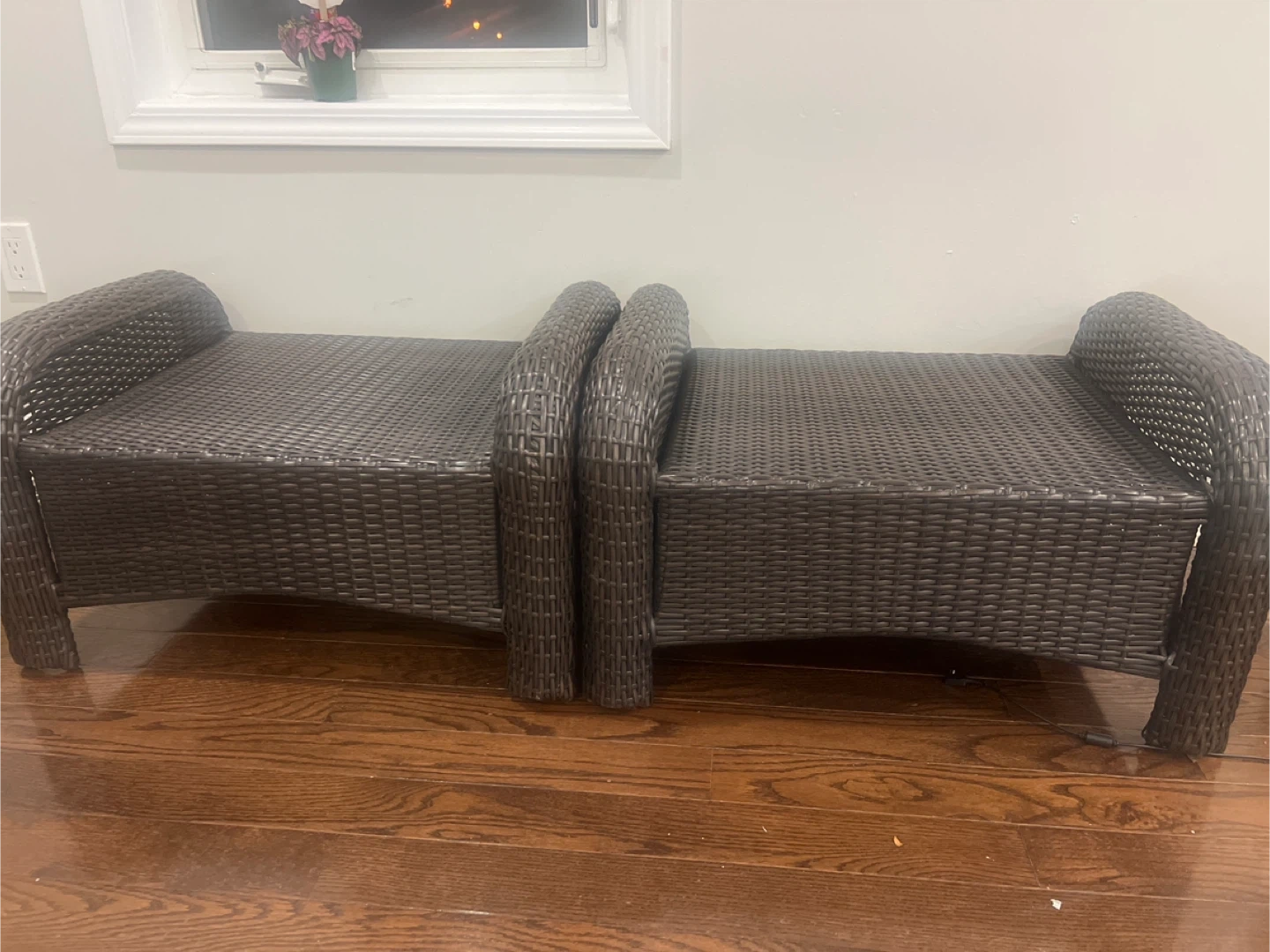 Selling a comfy wicker patio seats! It's in great shape and perfect for relaxing outdoors. The dark brown colour will match any decor. It's a great addition to any backyard or patio setup