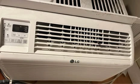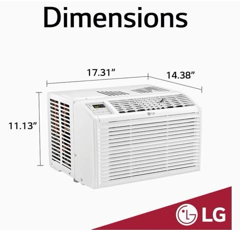 Air conditioner: LG LW6017R 6,000 BTU 115V Window Air Conditioner. Washable air filter with clean alert. 11.13” x 17.31” x 14.38” or 28.27 cm x 43.97 cm x 36.53 cm; 39.6 lbs/17.96 kg.