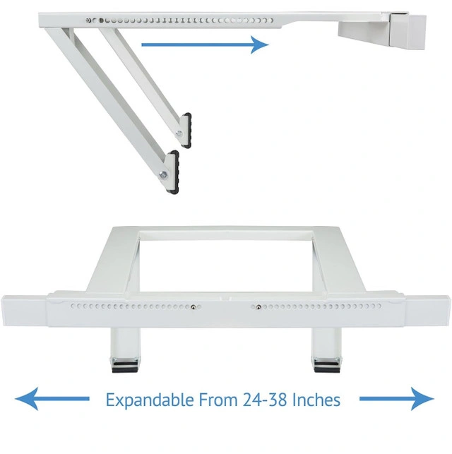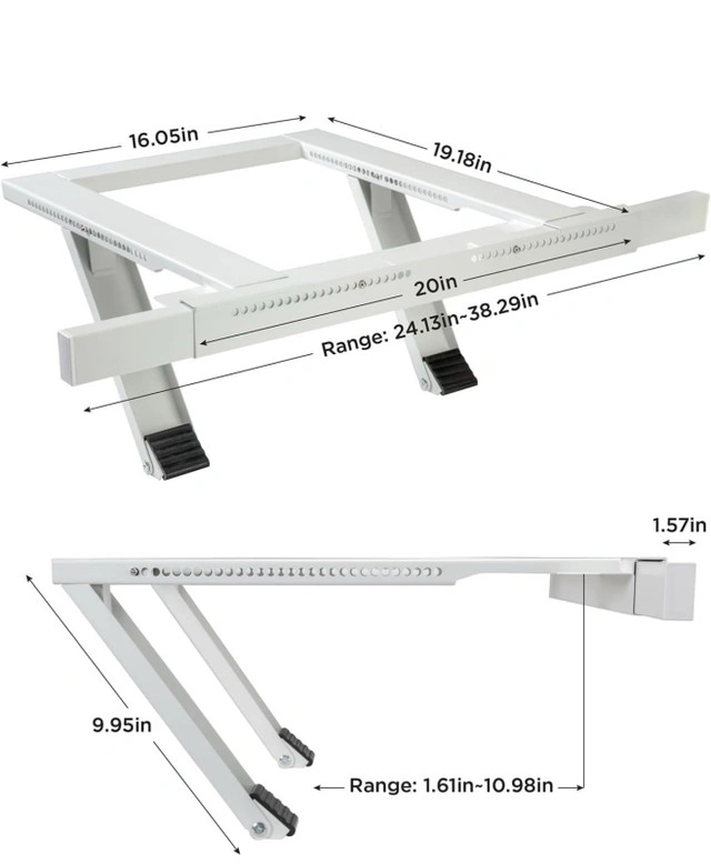 Mount: Ivation air conditioner support bracket. No tools or drilling required, easy to install universal window AC mount. Made from heavy duty steel, Holds up to 200 lbs/90 kg, fits single or double hung windows. Expands from 24” to 38” to fit in most single or double hung windows; adapts to exterior wall thickness of 4” to 11”. 9.19 lbs/4.17 kg.