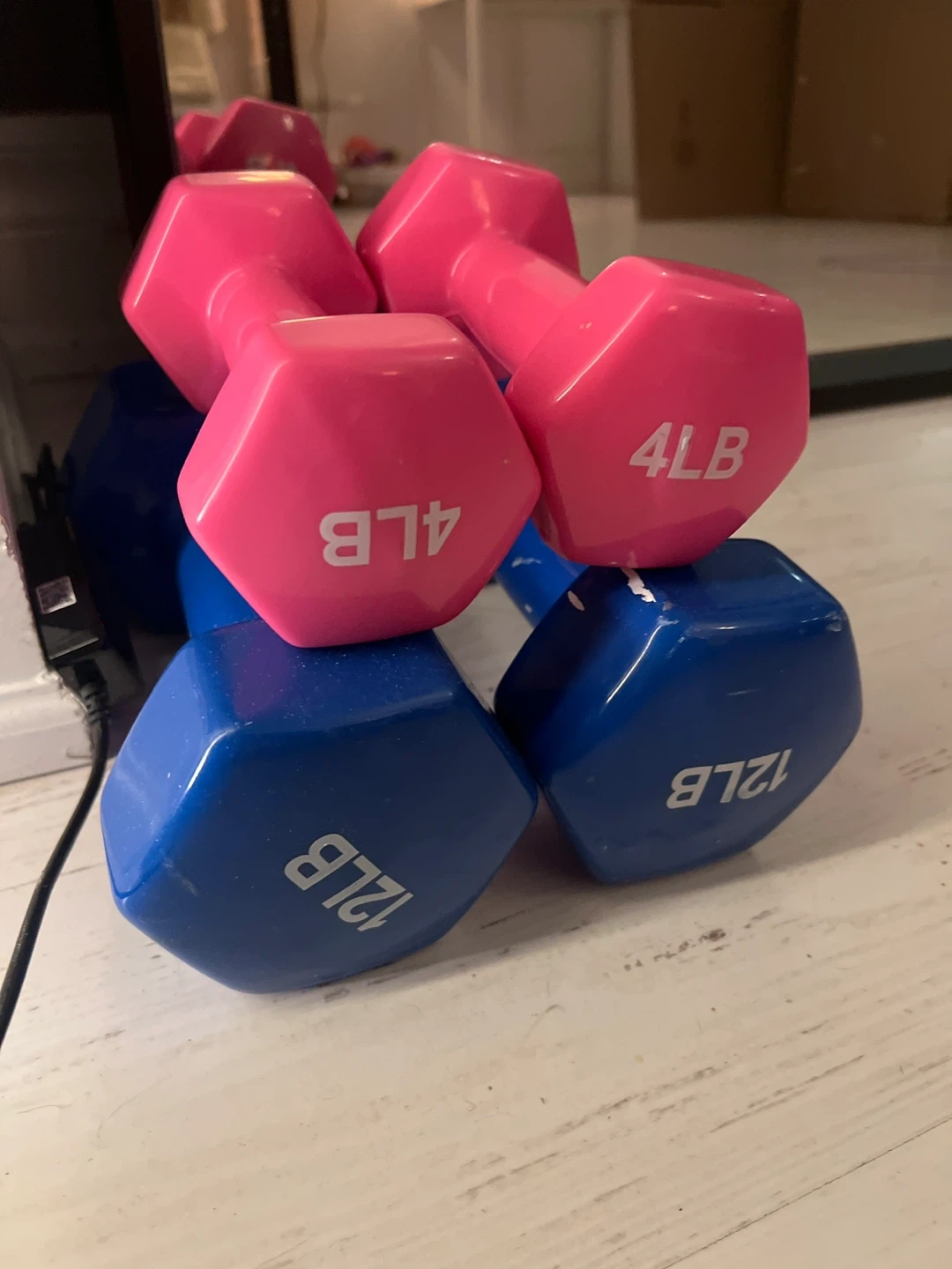 Selling a set of dumbbells! There are two pink 4lb weights and two blue 12lb weights. Perfect for at-home workouts!