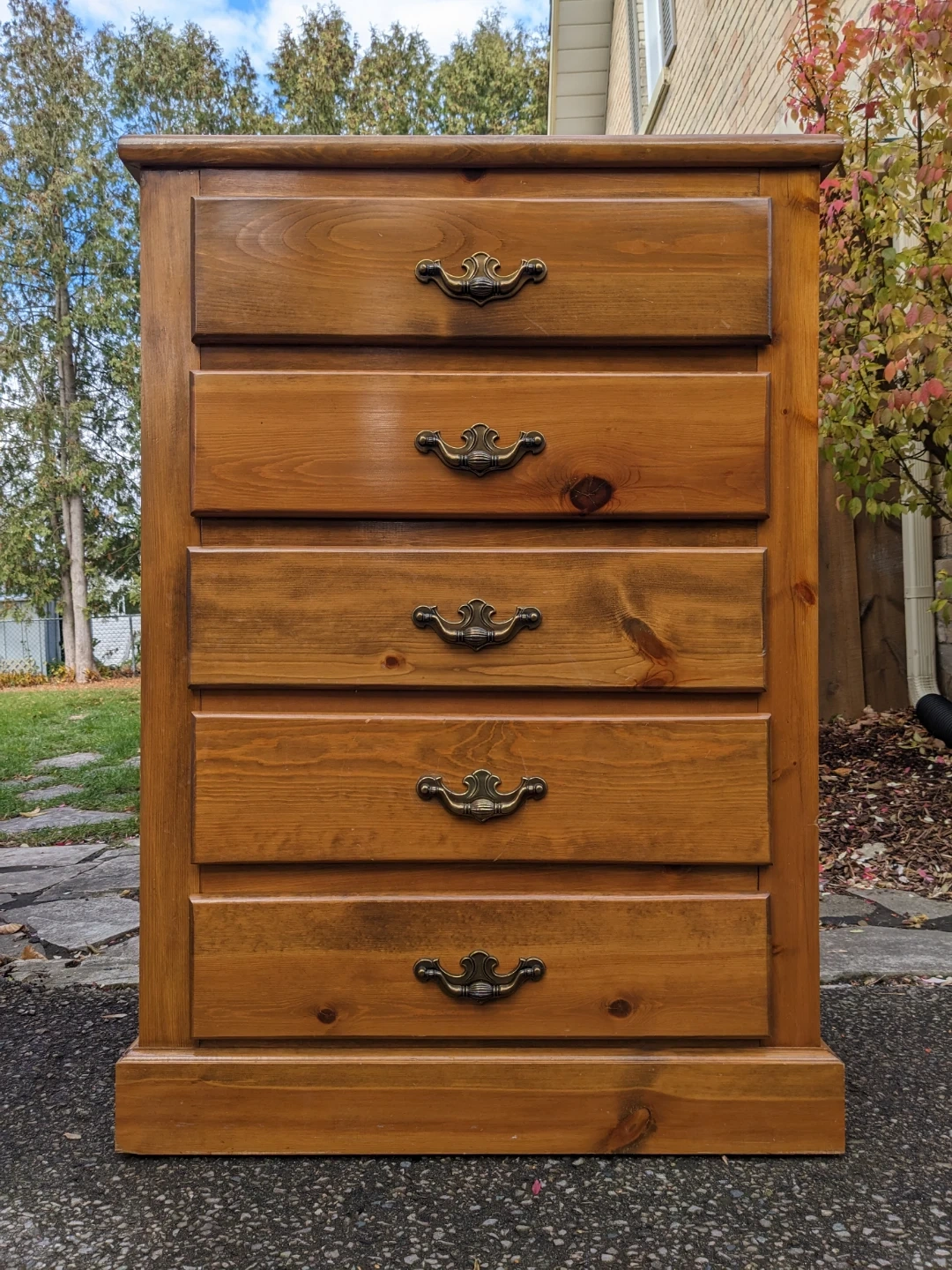 This tallboy dresser in solid pine features 5 spacious drawers that all open and close smoothly and are in pristine condition inside.