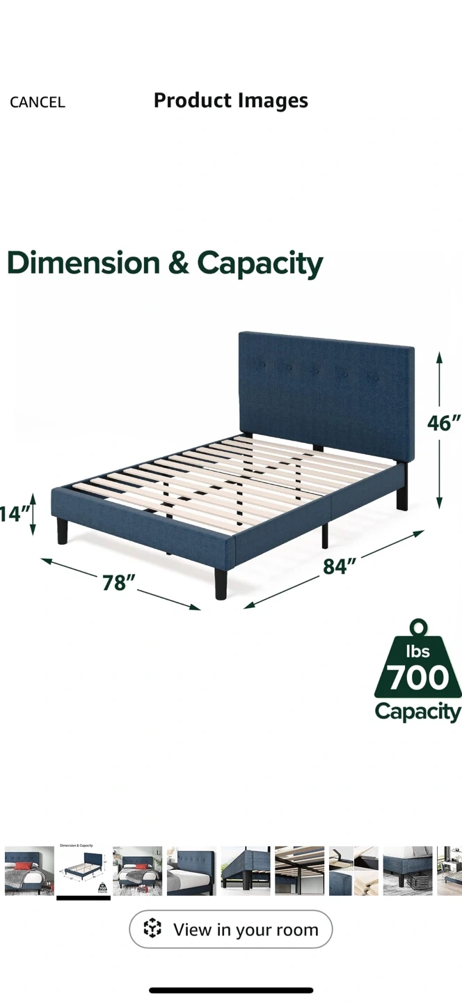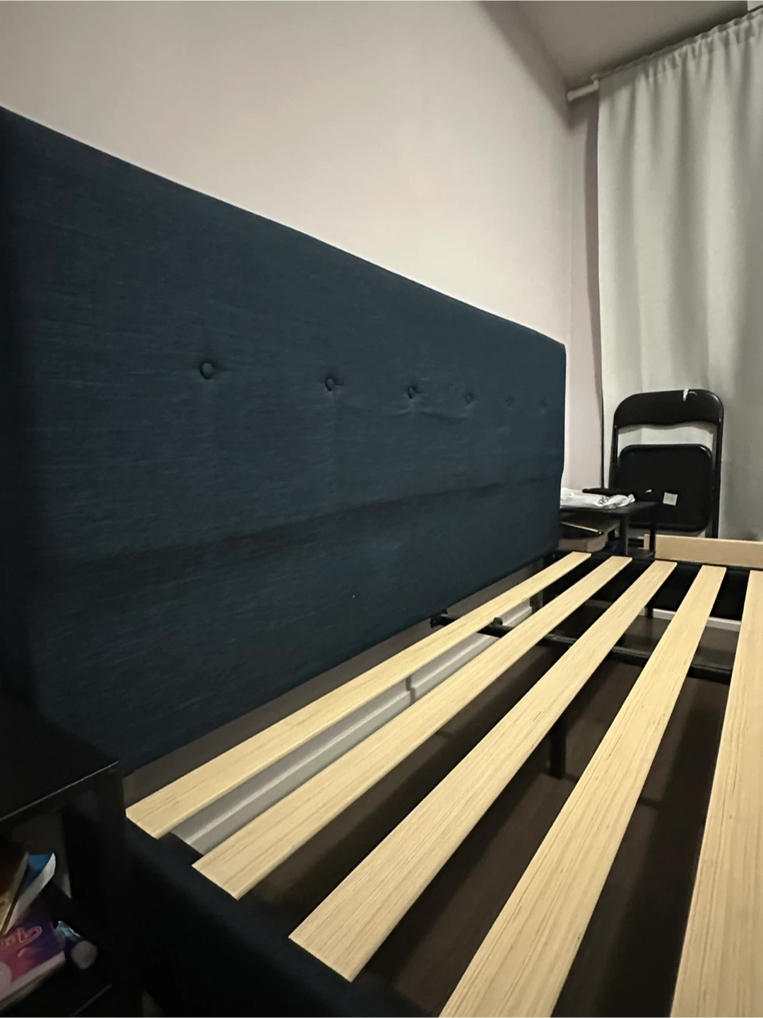 Selling a full-size upholstered platform bed frame in a nice blue colour! It's in great shape and ready for a new home. The bed frame measures 84" in length and 78" in width, with a headboard height of 46" and a frame height of 14". It can support up to 700 lbs
