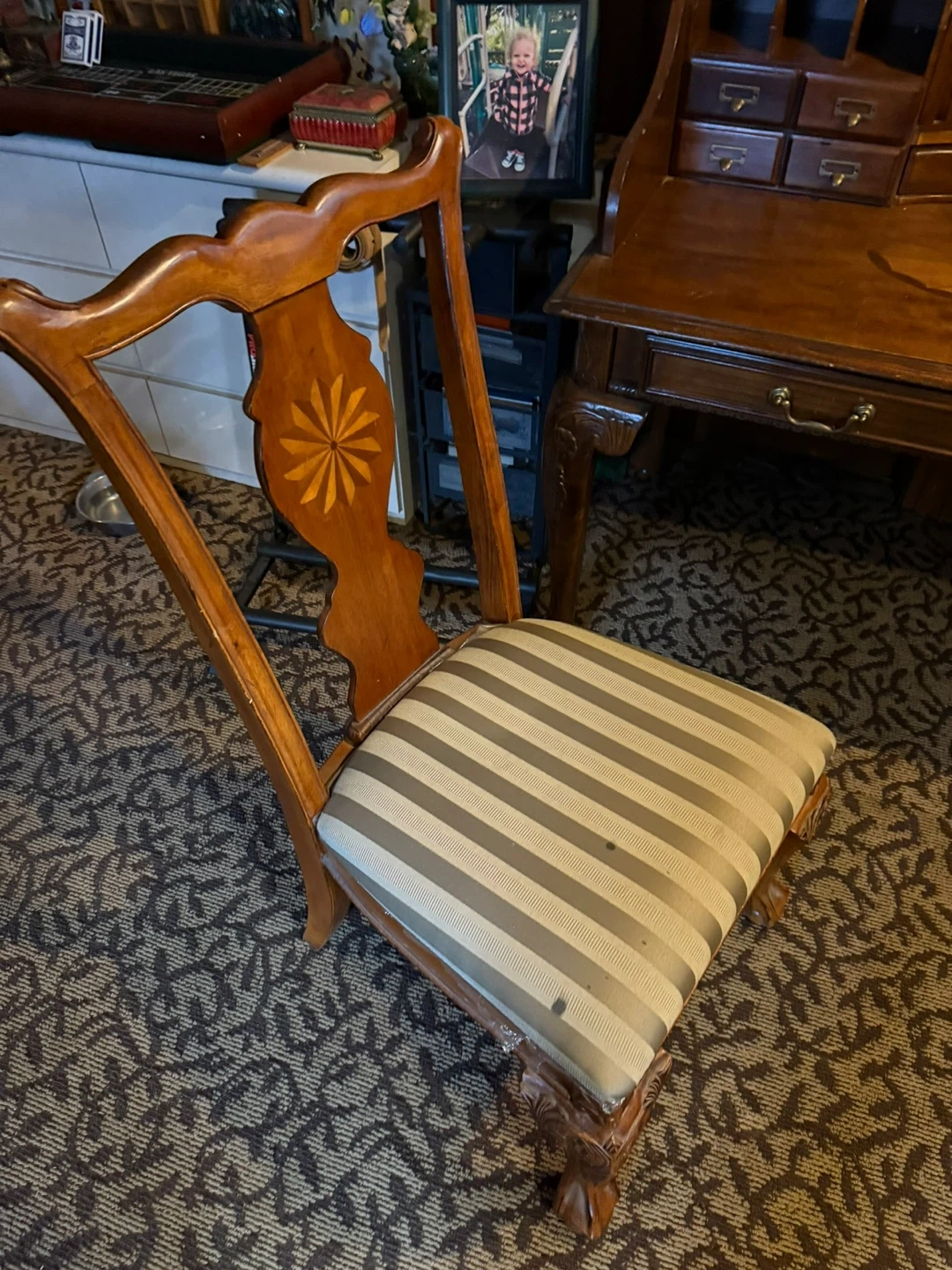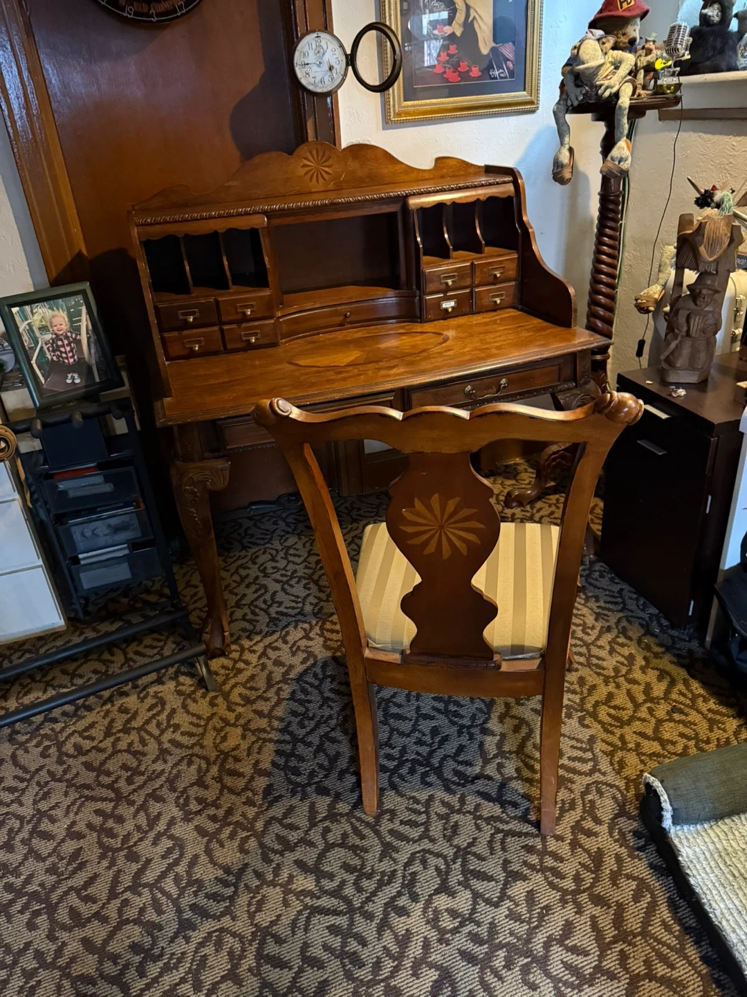 Selling a beautiful antique wooden secretary desk with a matching chair. The desk features multiple drawers and compartments, providing ample storage space. The chair has a striped seat. This set would add a touch of vintage charm to any room!