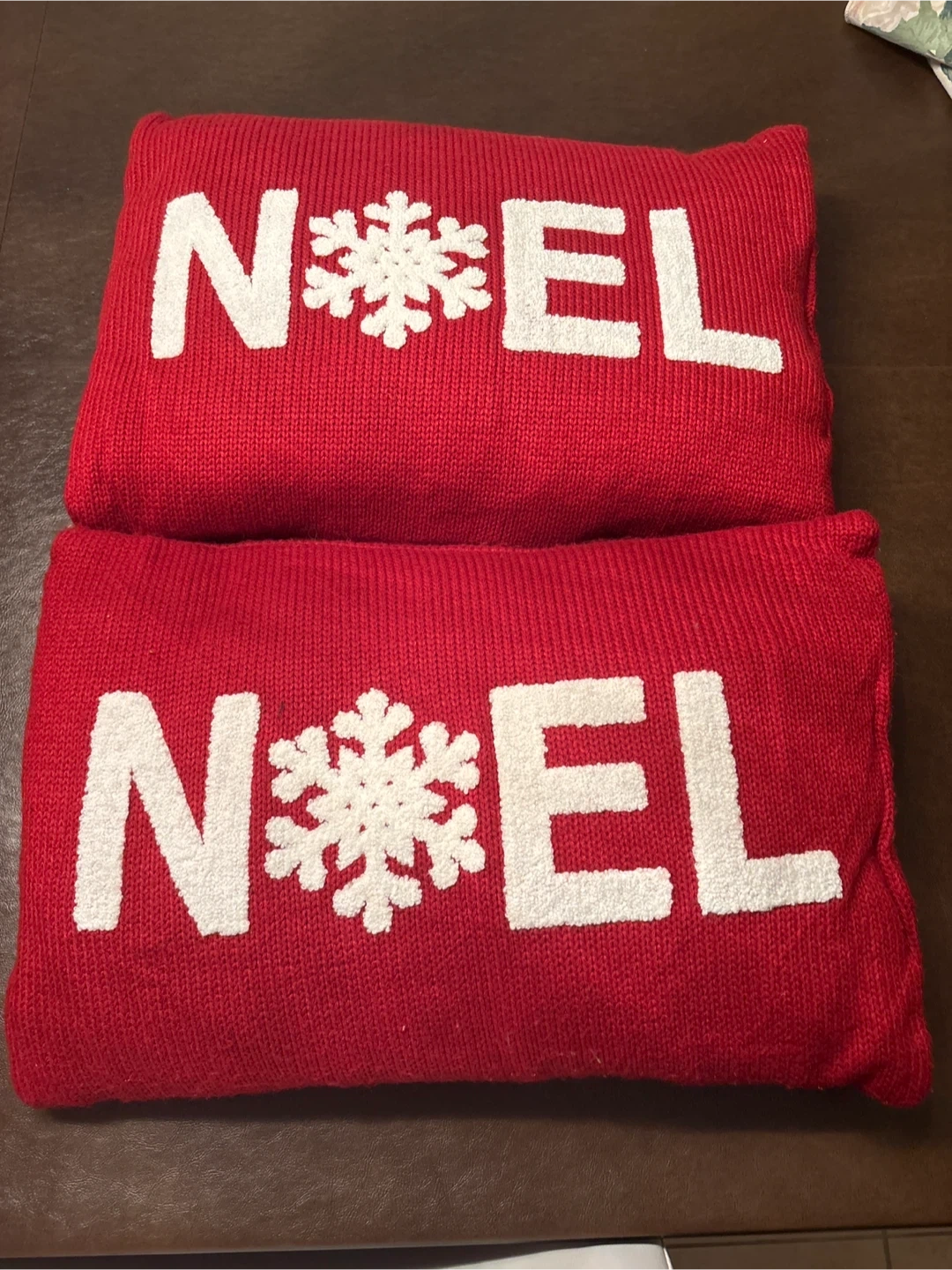 Selling a set of two red Christmas pillows! They have the word 'Noel' with a snowflake design. Perfect for adding a festive touch to your home during the holidays