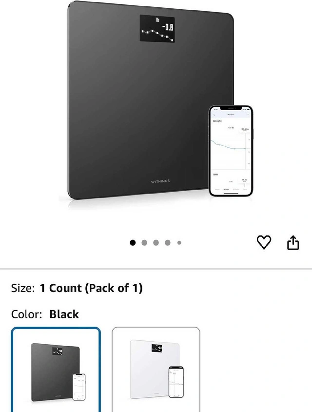 Withings Smart Scale – Wi-Fi Body Scale with BMI, Multi-User Profiles, Pregnancy & Baby Modes | Black New (Open Box) Box opened but item unused — tested !!! Brand: Withings Color: Black Recommended Use: Personal Health Monitoring Display Type: Digital Weight Limit: 180 kg Special Features: Wi-Fi Sync, Multi-User, Weather Forecasts, Pregnancy Mode, Baby Mode, Health App Sync --- #1 Worldwide — The Original Smart Scale Withings is the inventor of the smart scale, trusted globally for accuracy, durability, and seamless health tracking. Perfect for individuals, families, athletes, or anyone serious about monitoring long-term wellness. --- Advanced Weight & Health Tracking See more than just numbers — the scale displays a weight trend graph, giving you clear insights