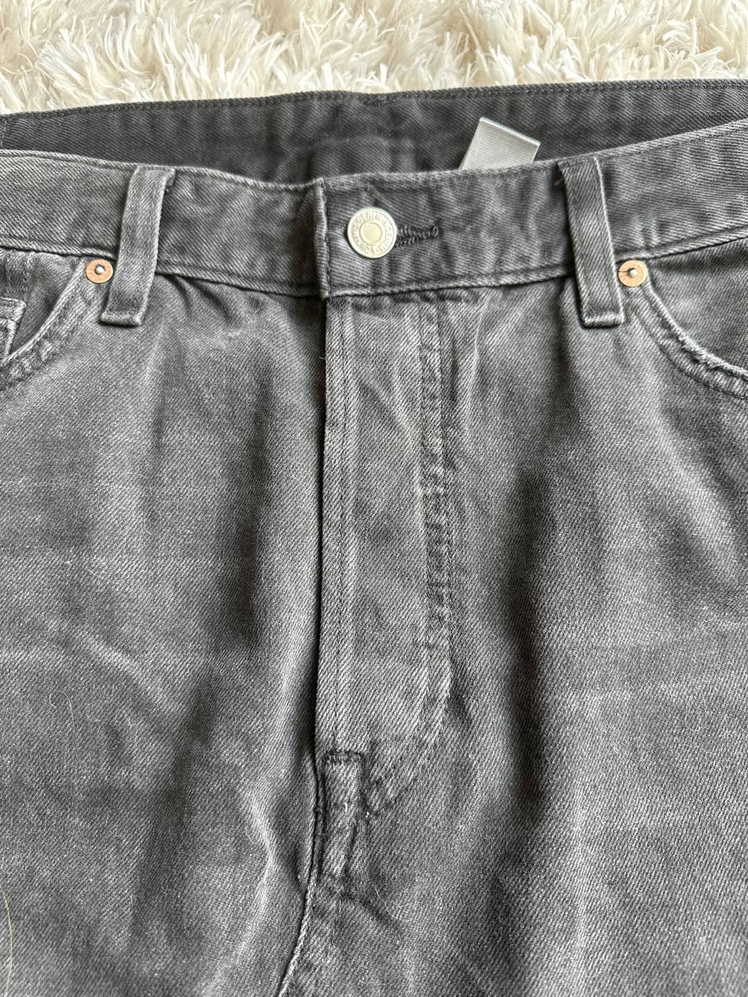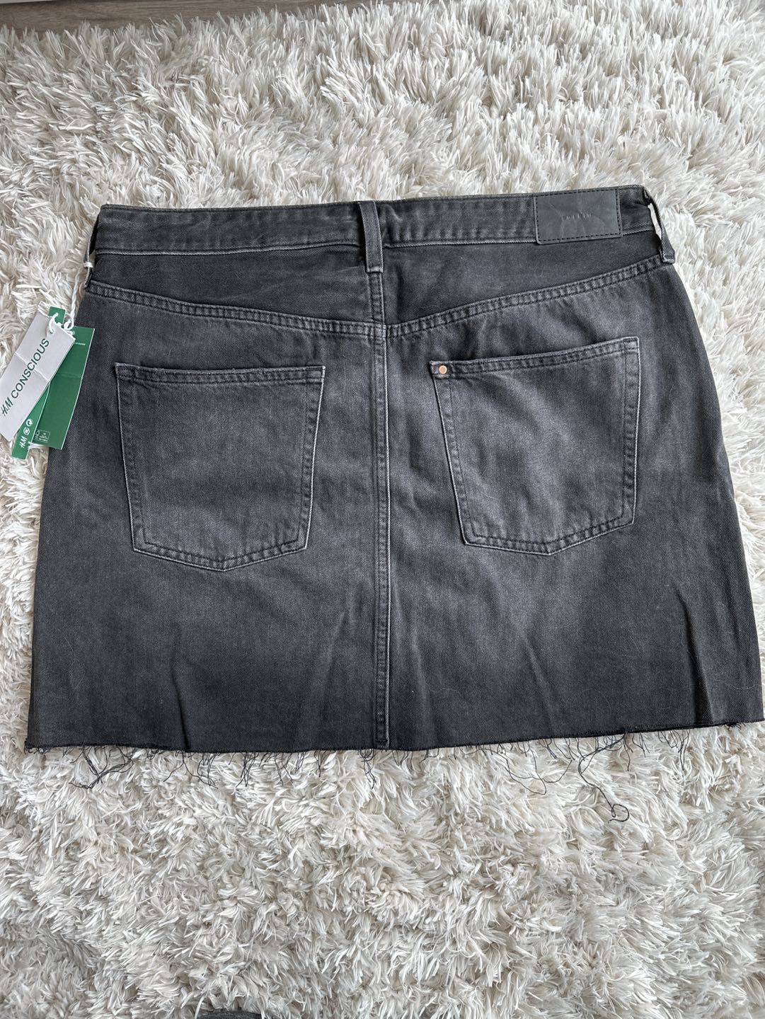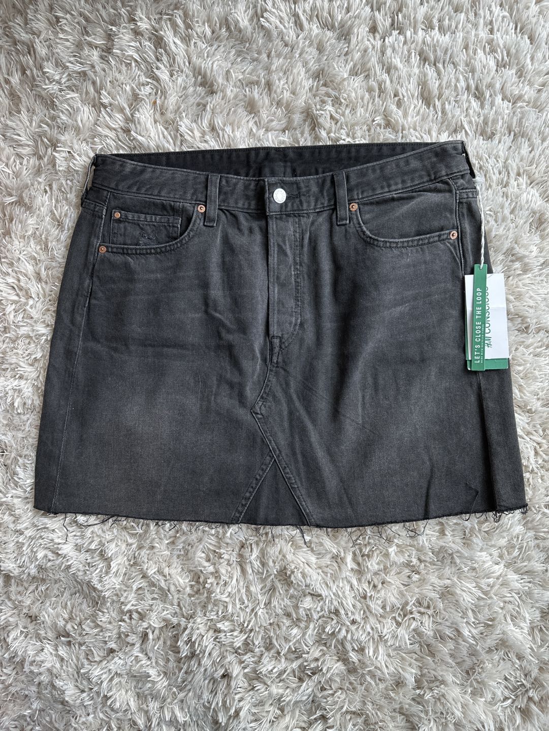 366Brand new 5-pocket skirt in washed denim with a high waist, button fly and frayed, raw-edge hem. Never worn! Size 14