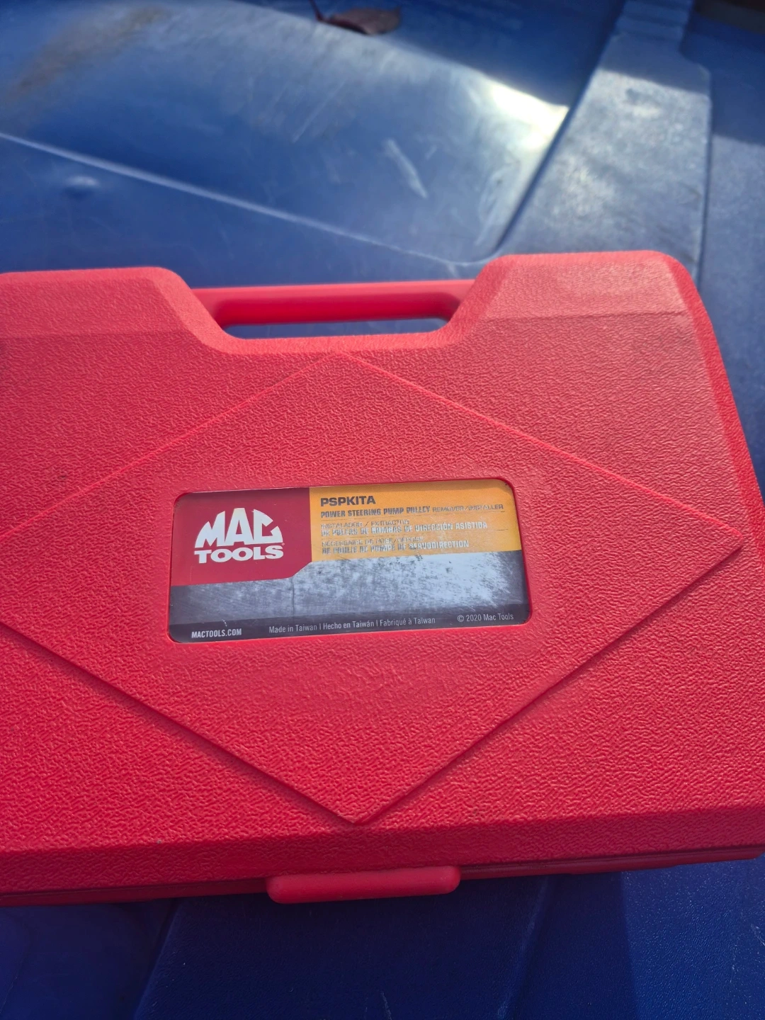 Selling a Mac Tools power steering pump pulley remover and installer kit, model PSPKITA. It's designed to prevent damage to pump or internal parts. This set includes adapters and spacers to install pulleys to the correct depth. Comes in its original red case