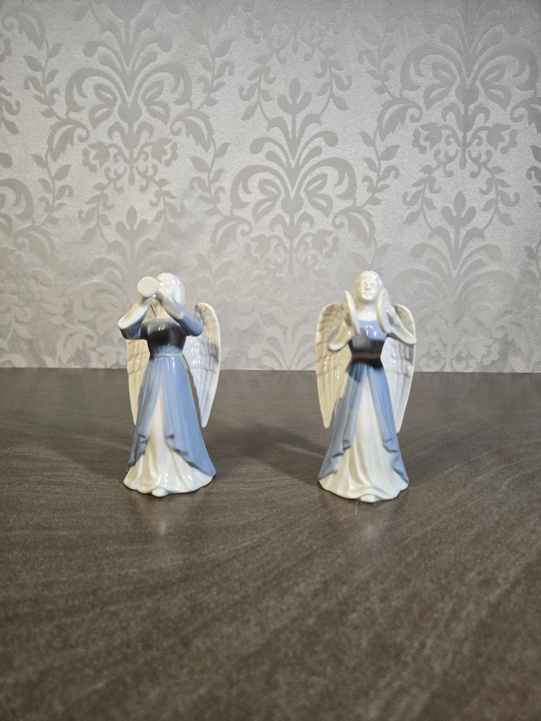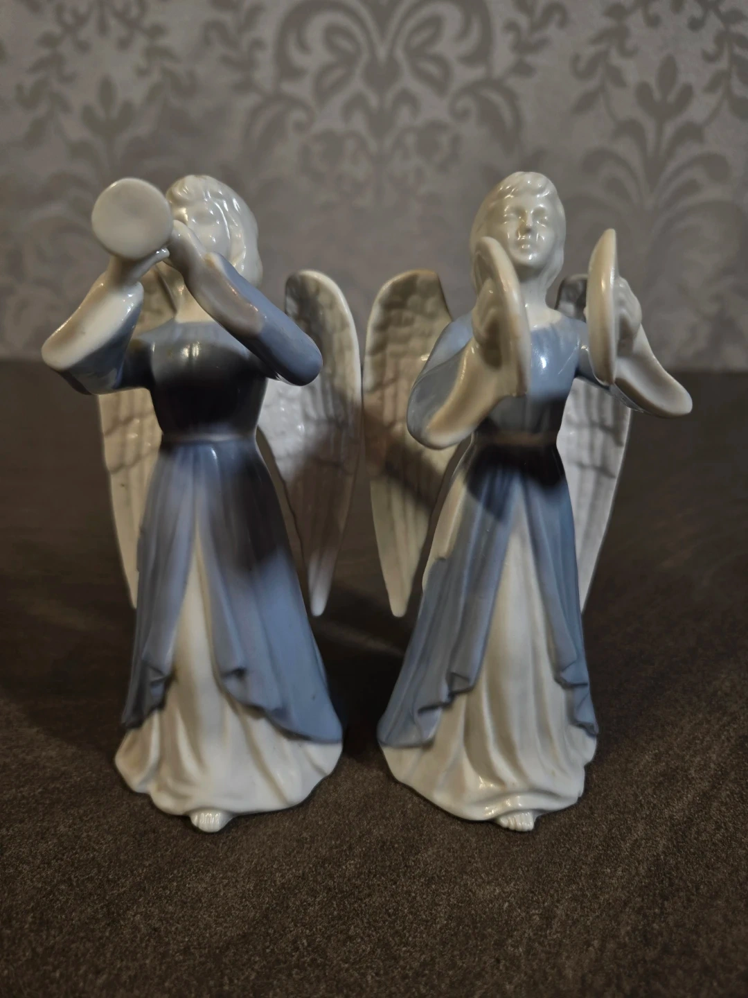 Excellent condition. Angels dressed in blue and white gowns and playing instruments. Approximately 6" tall and 3" wide. Cross-posted.