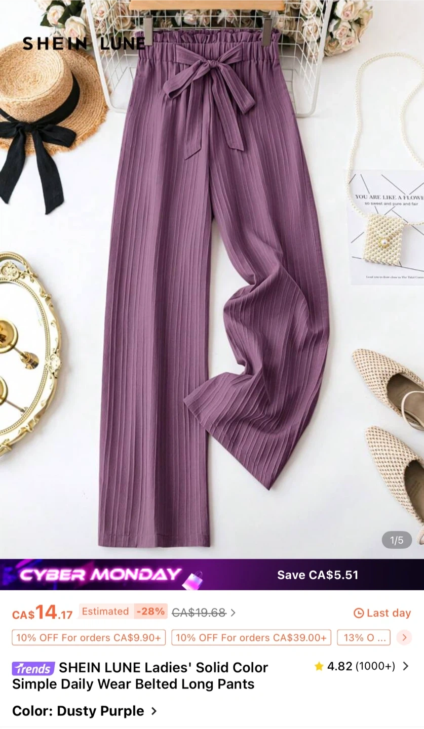 Selling SHEIN LUNE ladies' solid colour long pants. They're a lovely dusty purple colour, perfect for daily wear!