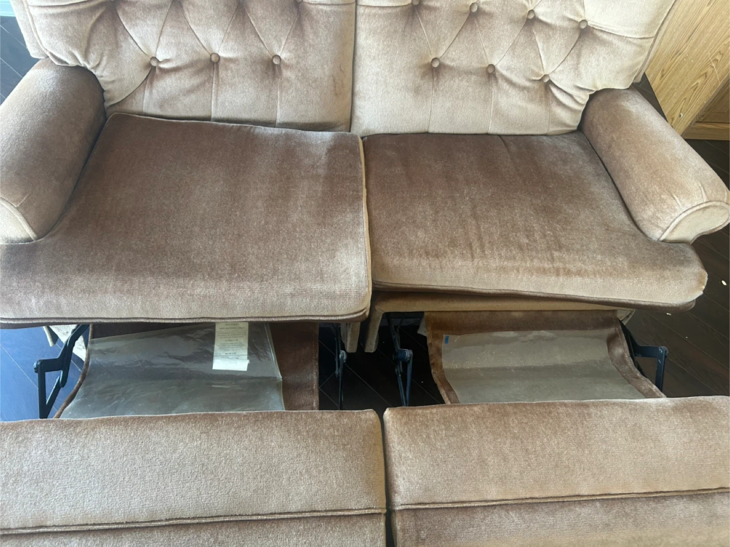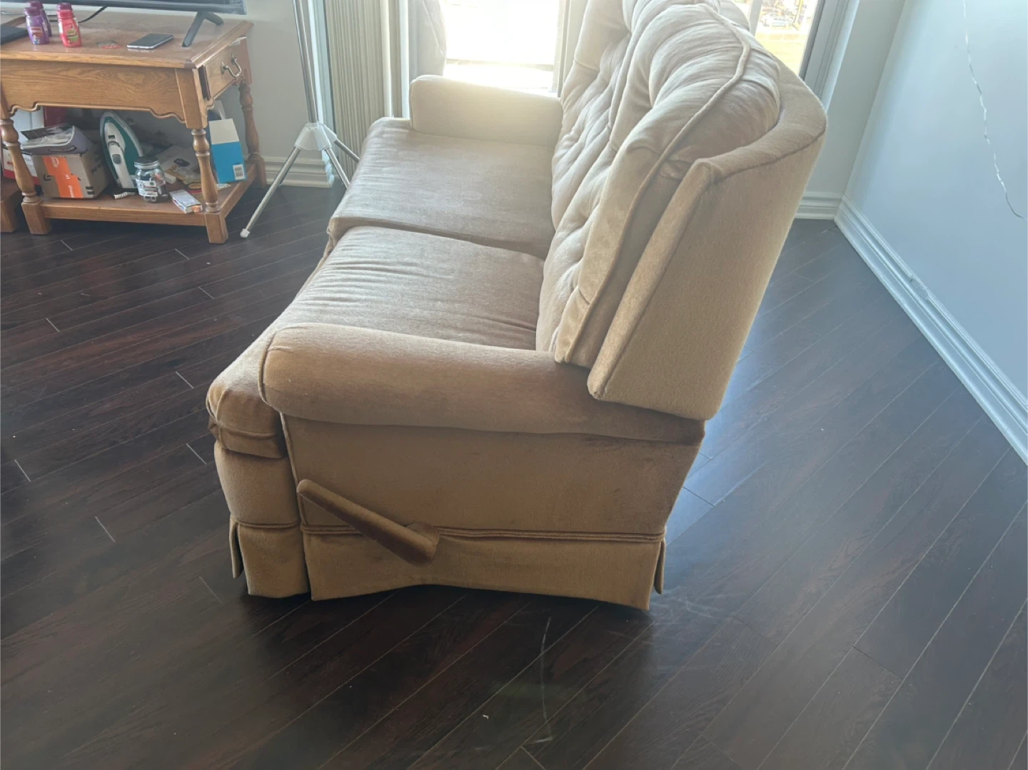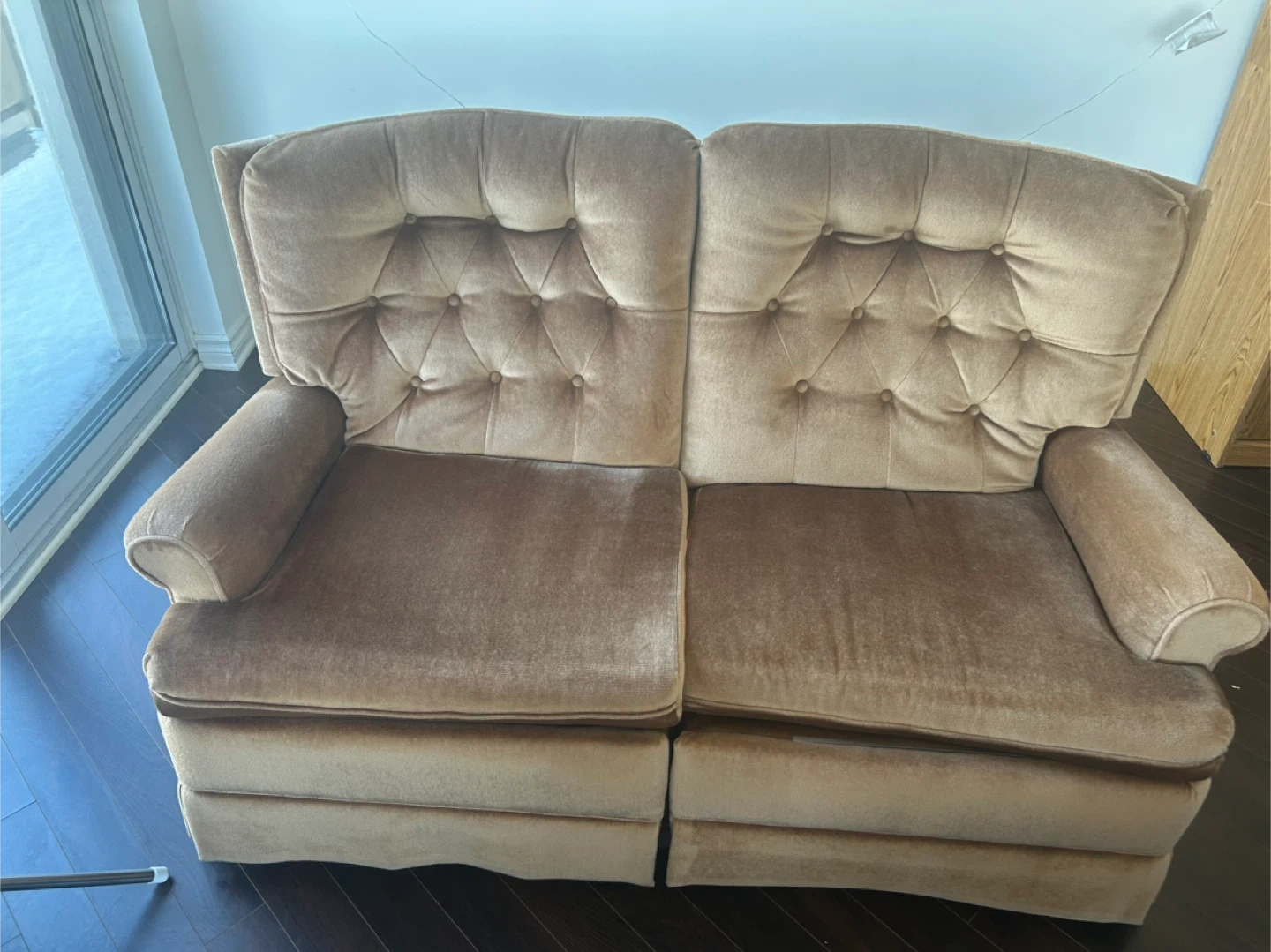 2 seater recliner couch . Bought from a thrift store for $120 last June. Height- 32.5 inches, length 5 feet, width ( before reclining)- 28.5 inches, width ( after reclining)- 49 inches.