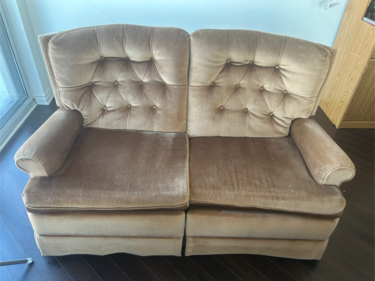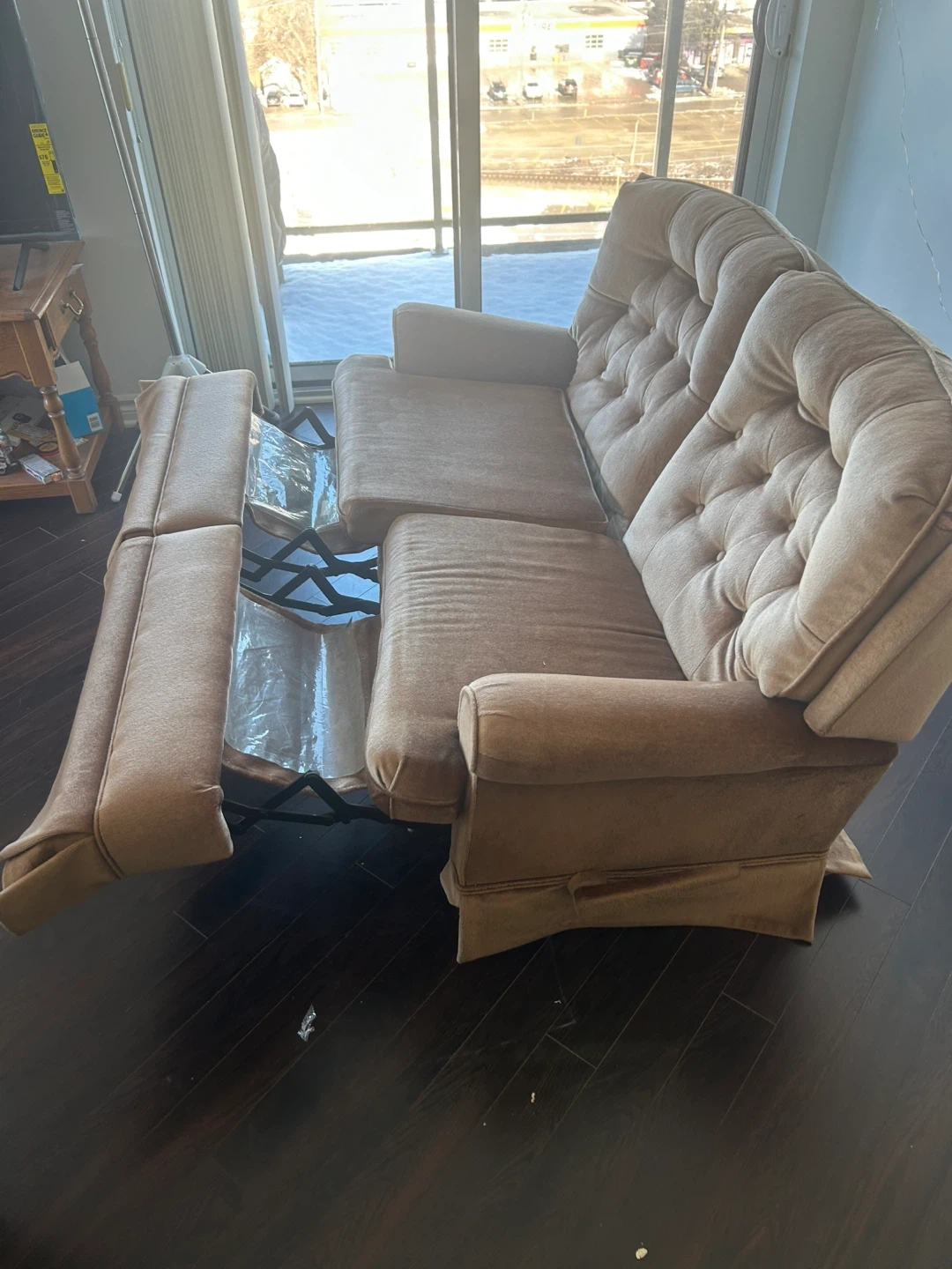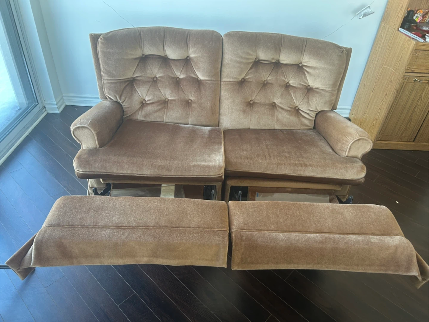 2 seater recliner couch . Bought from a thrift store for $120 last June. Height- 32.5 inches, length 5 feet, width ( before reclining)- 28.5 inches, width ( after reclining)- 49 inches.