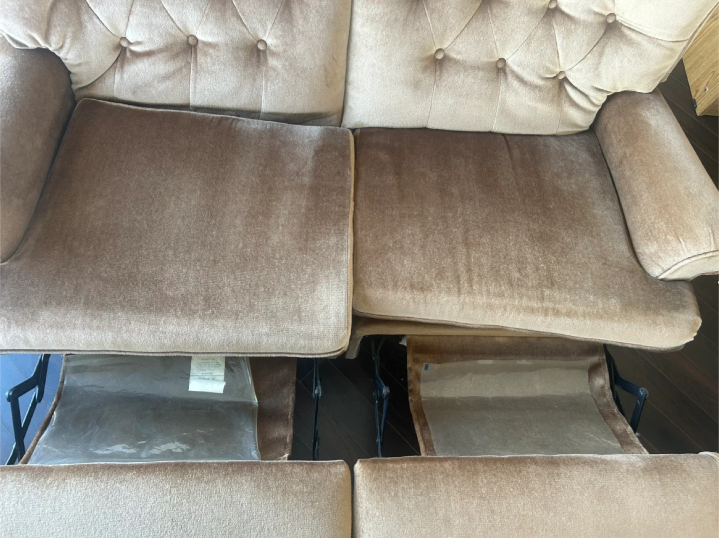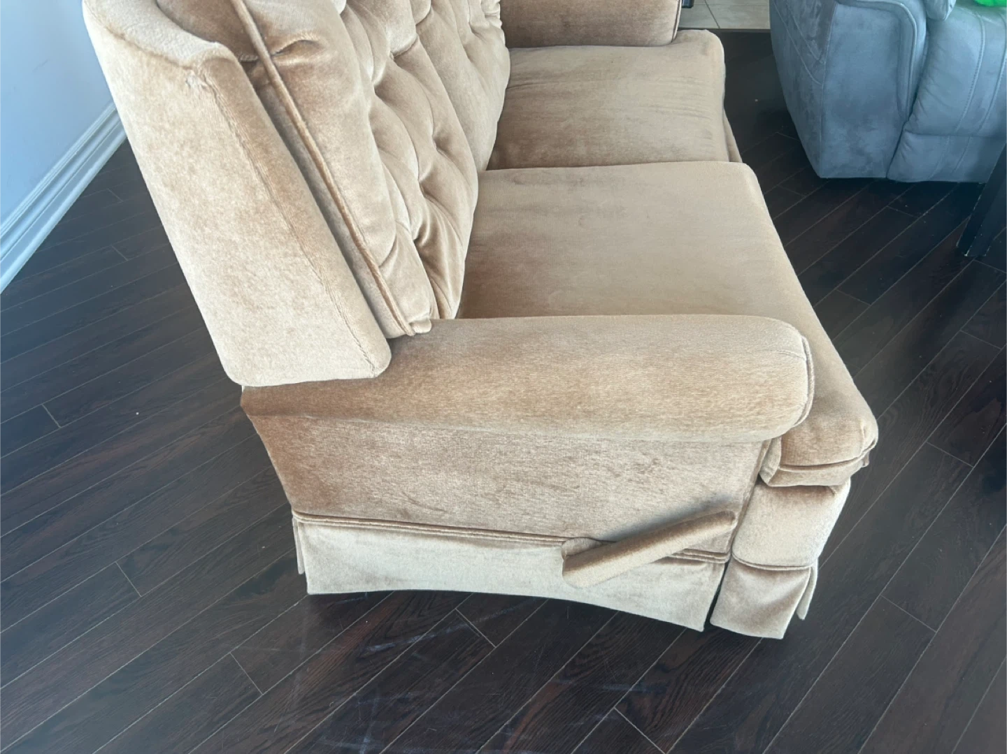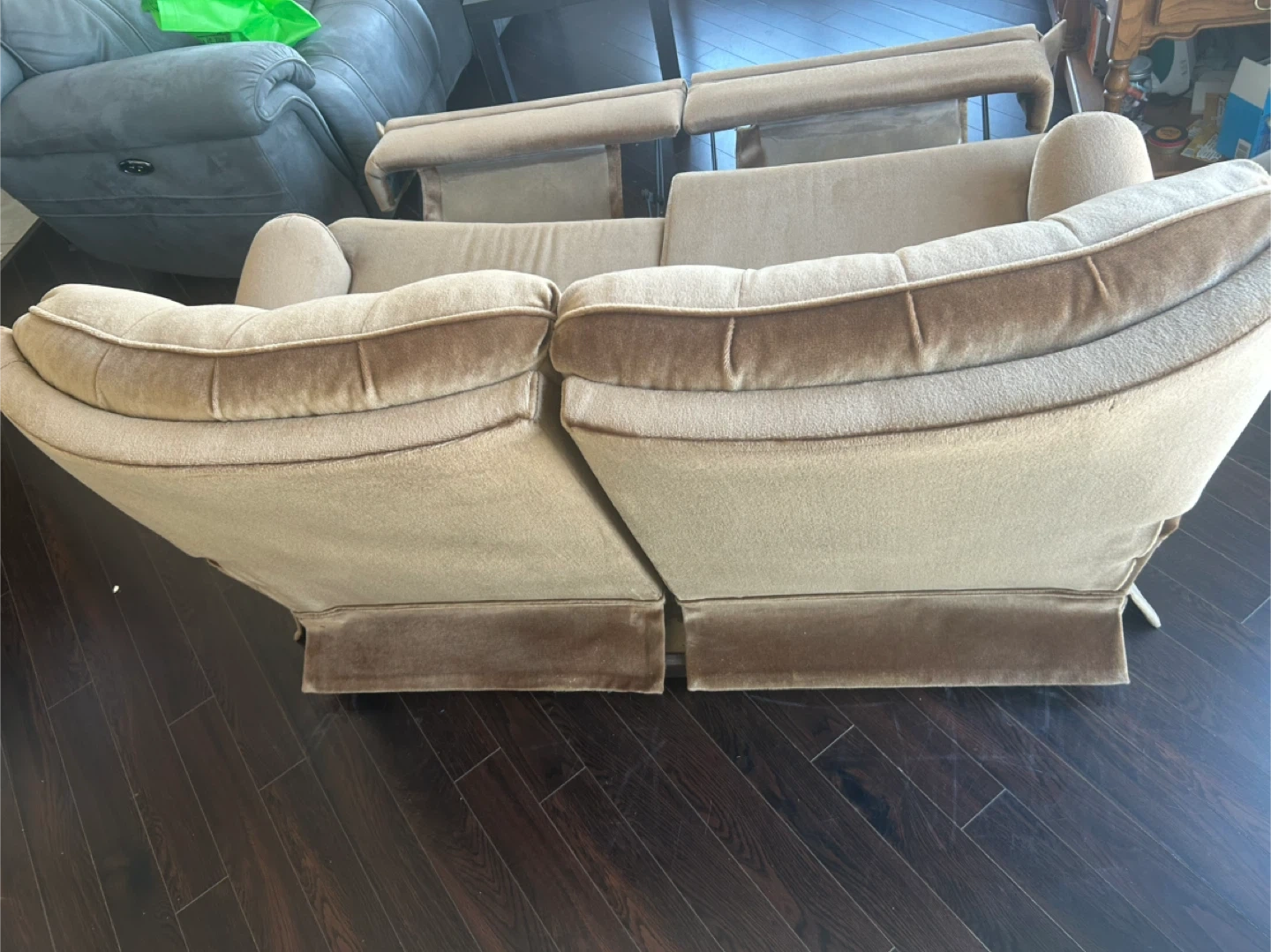 2 seater recliner couch . Bought from a thrift store for $120 last June. Height- 32.5 inches, length 5 feet, width ( before reclining)- 28.5 inches, width ( after reclining)- 49 inches.