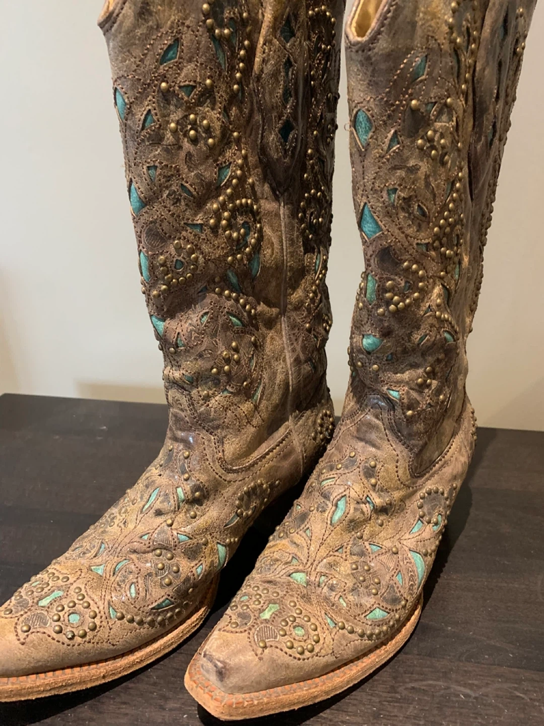 Selling women’s turquoise inlay and studs brown snip toe cowboy boots. Handmade and beautiful quality leather.
