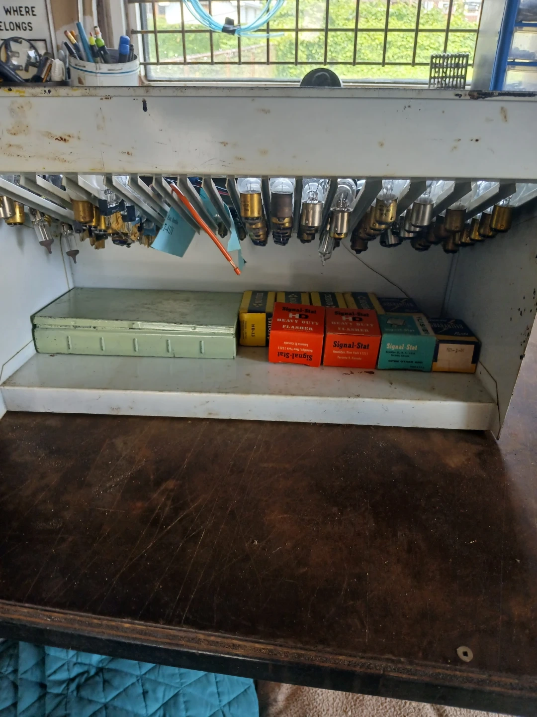 Vintage GE automotive bulb display case with a selection of bulbs and flasher units. Includes boxes of Tridon and Signal-Stat HD Heavy Duty Flasher units. Great for a garage or shop!