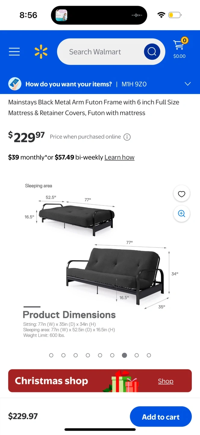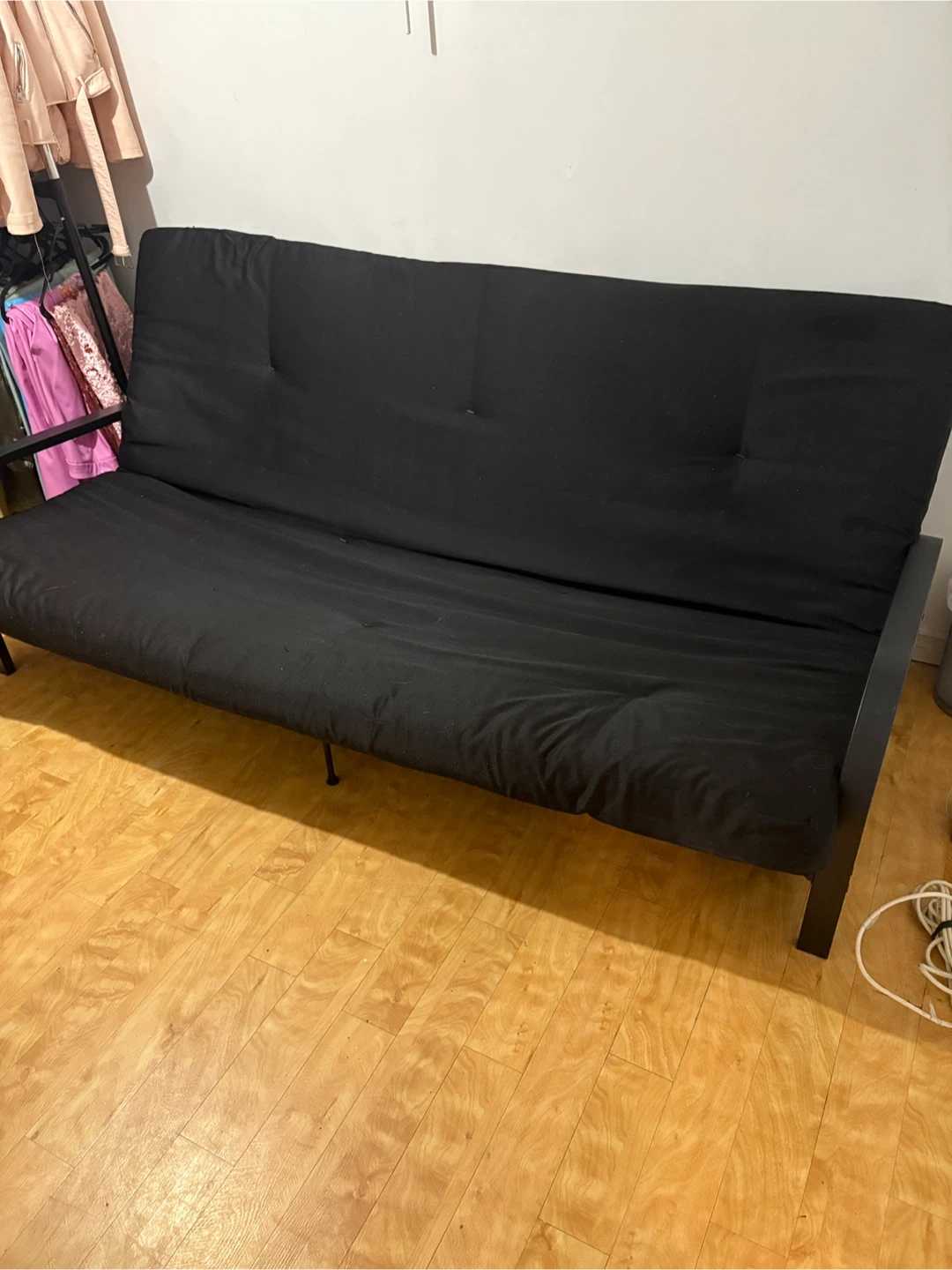 Selling a Mainstays black metal arm futon frame with a 6-inch full-size mattress and retainer covers. It's in good condition and perfect for a guest room or small space.