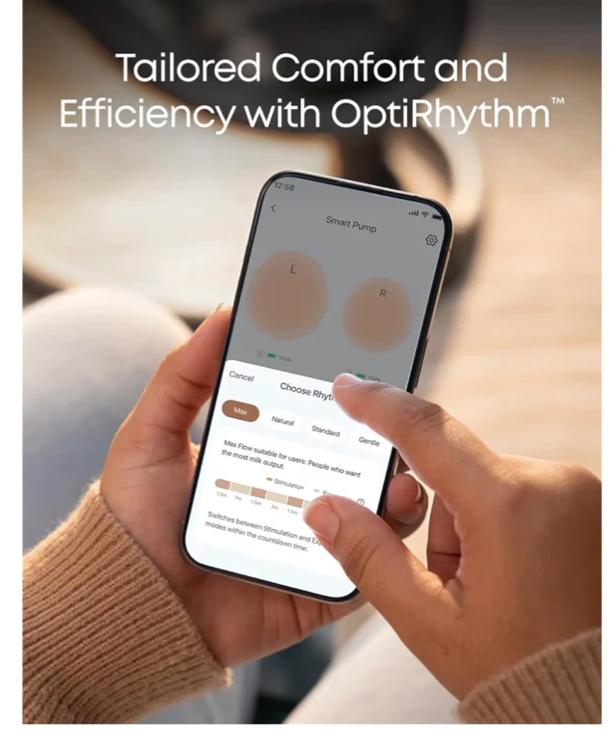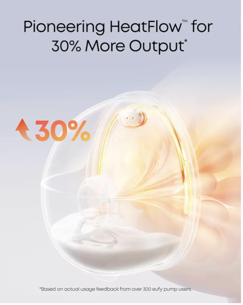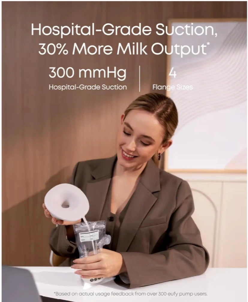 The eufy S1 Pro is a wearable breast pump with up to 300 mmHg hospital-grade suction, a closed system, and a quiet motor operating at under 46 dB. Key specifications include HeatFlow technology with seven heating levels from \(35^{\circ }\) to \(41^{\circ }\)C (\(95^{\circ }\) to \(105^{\circ }\)F), multiple pumping rhythms and intensities controlled via the eufy Baby app, and a rechargeable magnetic charging case that provides up to 5 days of power for the pump. It is made with BPA-free, food-grade silicone parts and comes with multiple flange sizes, including inserts, to fit various nipple sizes. Suction and modes Suction strength: Up to 300 mmHg (hospital-grade)Intensity levels: 7Speed levels: 3Rhythm modes: 4 professional rhythms available through the eufy Baby app, which can also be customized Heating technology HeatFlow technology: Built-in heating flange with gentle, spa-like warmth to help prevent clogs and boost milk outputHeating levels: 7 levels, from \(35^{\circ }\) to \(41^{\circ }\)C (\(95^{\circ }\) to \(105^{\circ }\)F) System and materials System type: Closed system to prevent milk from entering the tubingNoise level: Under 46 dBMaterials: BPA-free, food-grade silicone for all skin-contact componentsLeak protection: Double-seal, leakproof design Power and charging Internal battery: Provides up to 2.5 hours (150 minutes) of pumping time per chargeCharging case: Wireless magnetic charging case that holds up to 5 days of power for the pump App and control eufy Baby app: Connects wirelessly for control of all pumping functionsApp features: Control rhythms, intensity, and heating levels; track output; review pumping history