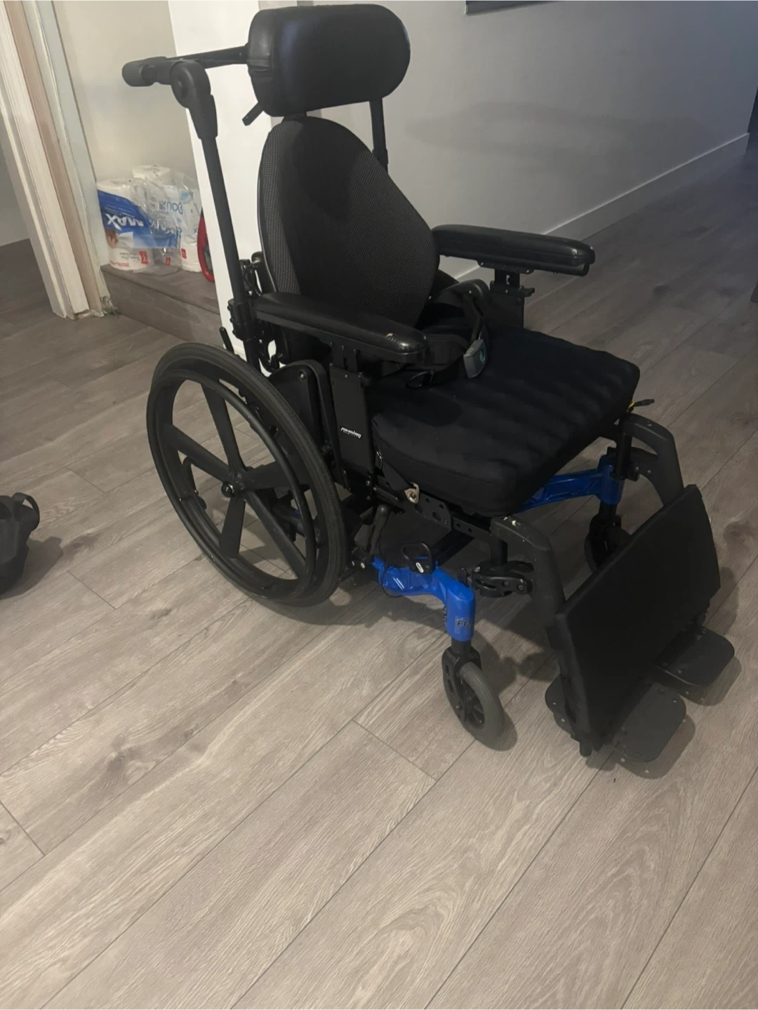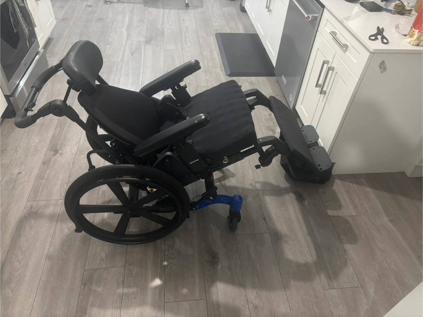 18x18 tilting wheelchair with a roho cushion, I can change out the cushions to different ones and this can also come with elevating leg rests for extra cost if you are needing that. This price includes delivery