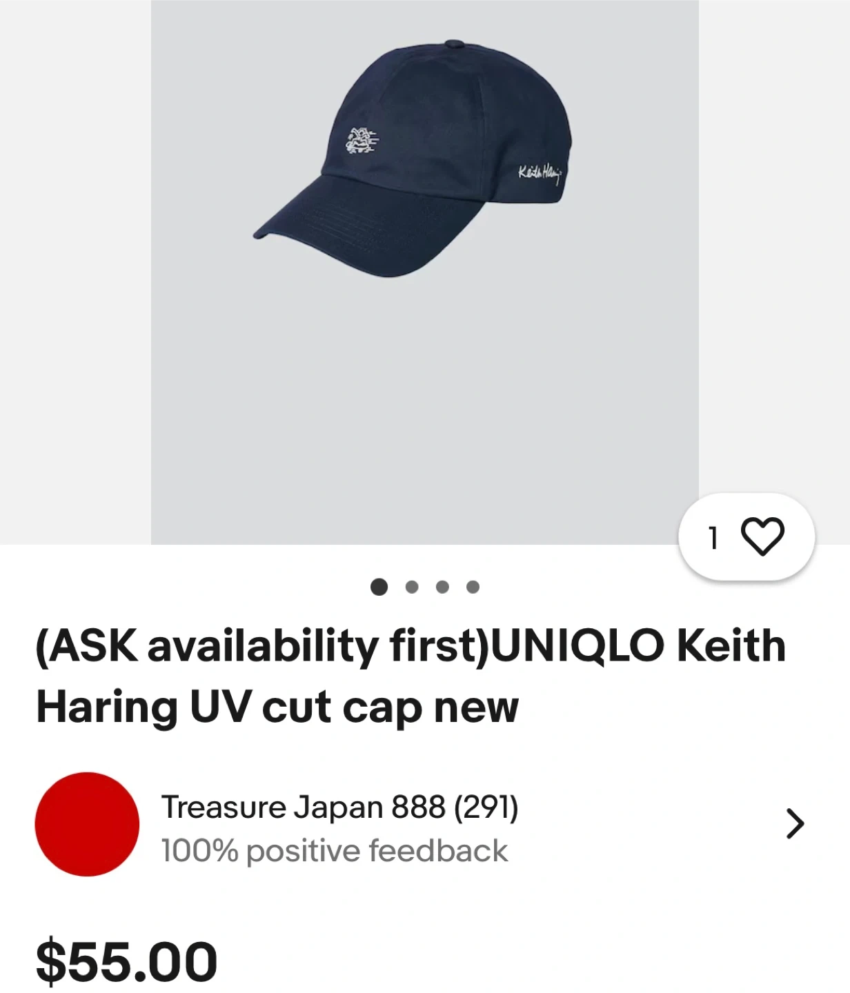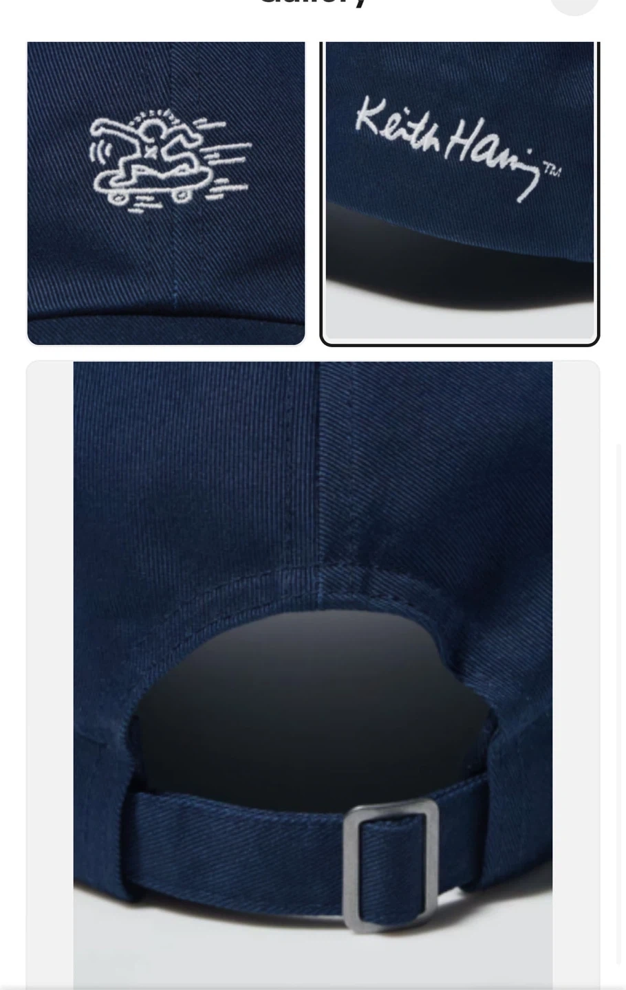607Check out this cool navy UNIQLO cap featuring Keith Haring's iconic artwork! It's a UV cut cap, perfect for keeping the sun off your face. it's in great condition!