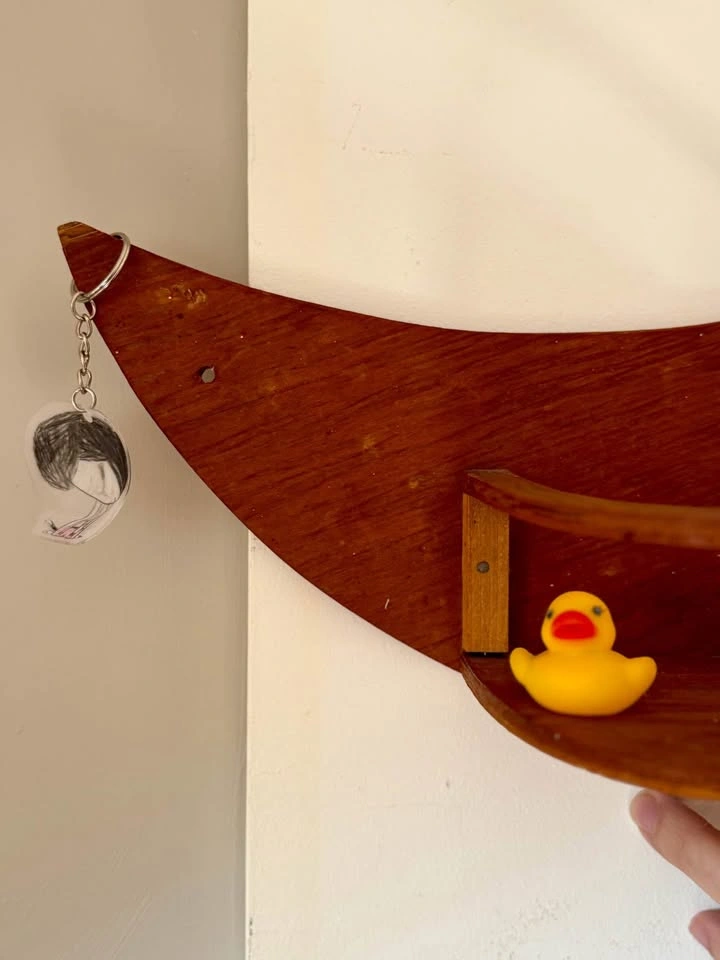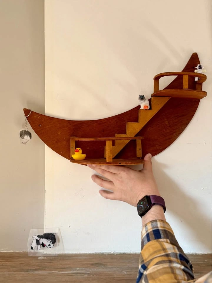 Whimsical vintage handmade wood crescent moon shelf features a unique staircase and railing design, perfect for displaying your favorite knick-knacks, crystals, or miniatures. A true piece of folk art and celestial decor!