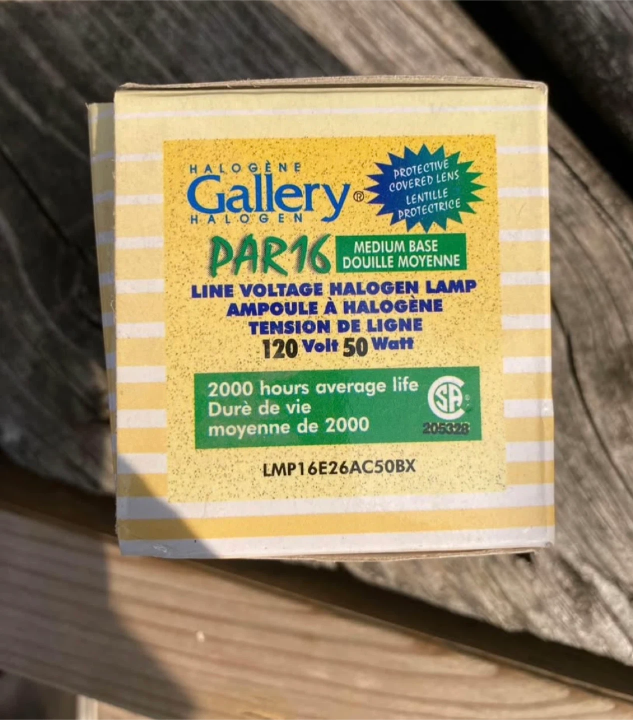 Selling a new Gallery Halogen PAR16 light bulb. It's a line voltage halogen lamp, 120 Volt 50 Watt with a medium base. It has an average life of 2000 hours and a protective covered lens. It also features an aluminum coated reflector. Comes in the original box!