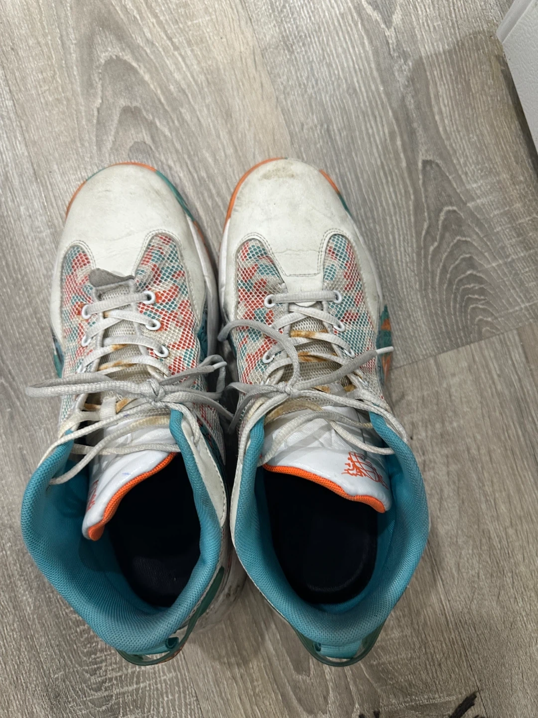 These athletic shoes are used and show signs of wear. They have a white base with colourful accents and a turquoise lining