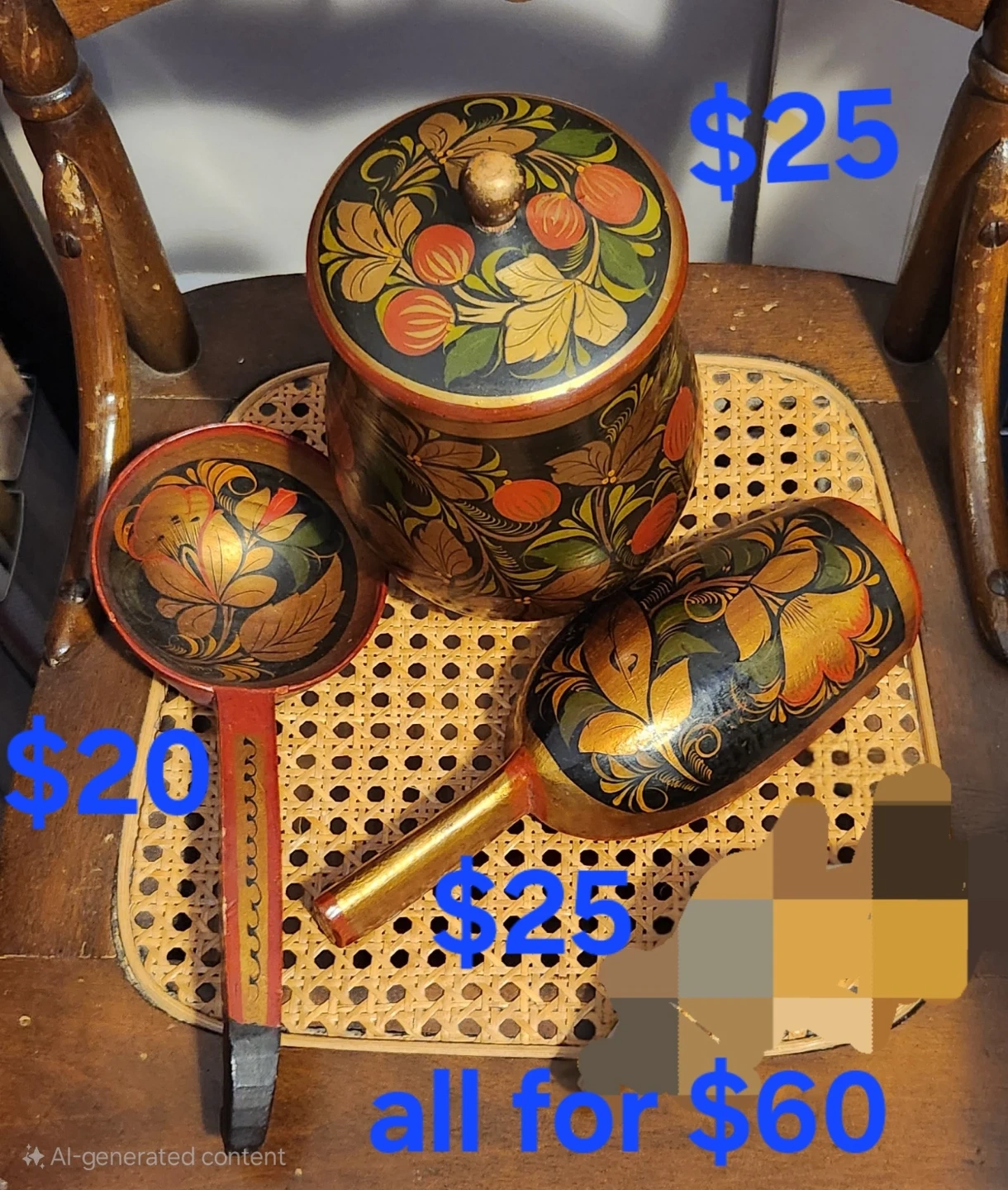 Buy & SellGenuine Vintage KhokhlomaGenuine Vintage Khokhloma$20Authentic Vintage Russian folk art. Hand crafted. Spoon, scoop & jar w/ lid. Bought originally in Russia. Only 2 previos owners.WHERE TO MEETCheck LocationView MapSELLERE1Donna PrattWalkerville250 reviews0 chats·0 favorites·4 views
