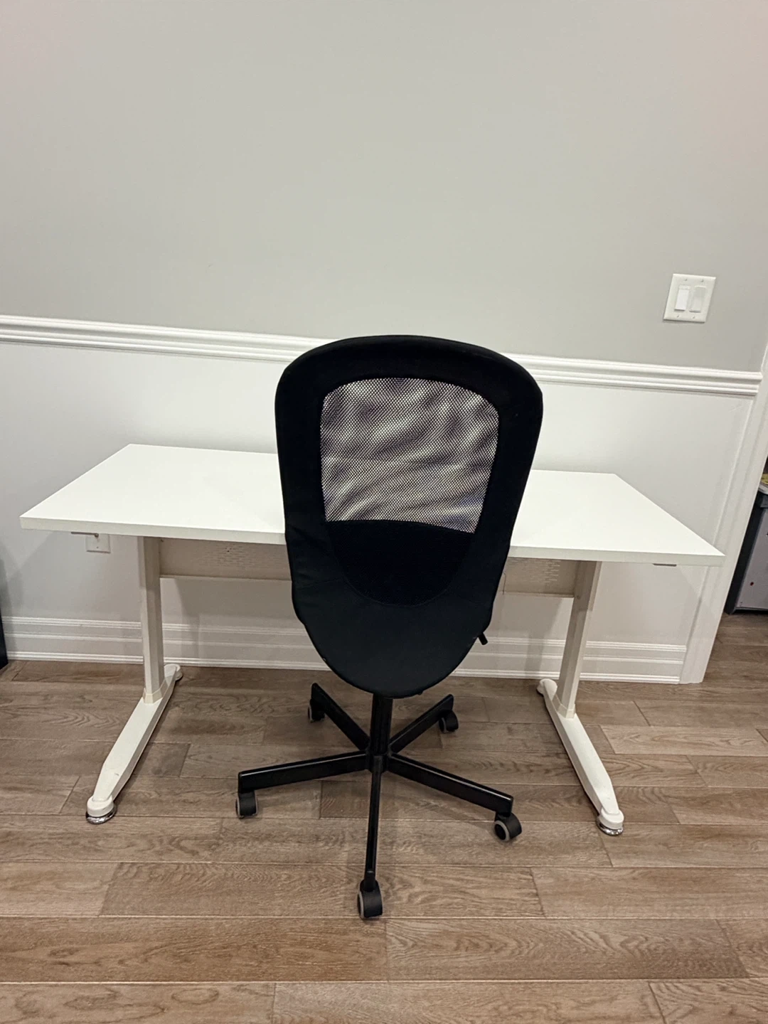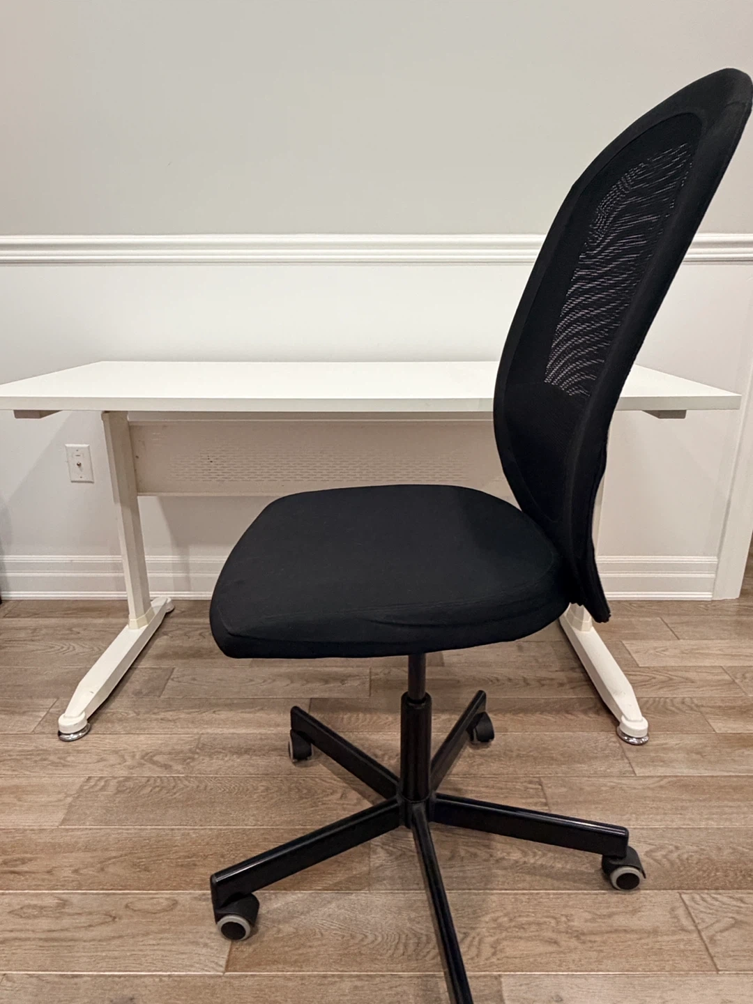 Selling a comfy black mesh office chair! It's in great shape and perfect for your home office setup. The mesh back provides good support and breathability, making it ideal for long work sessions