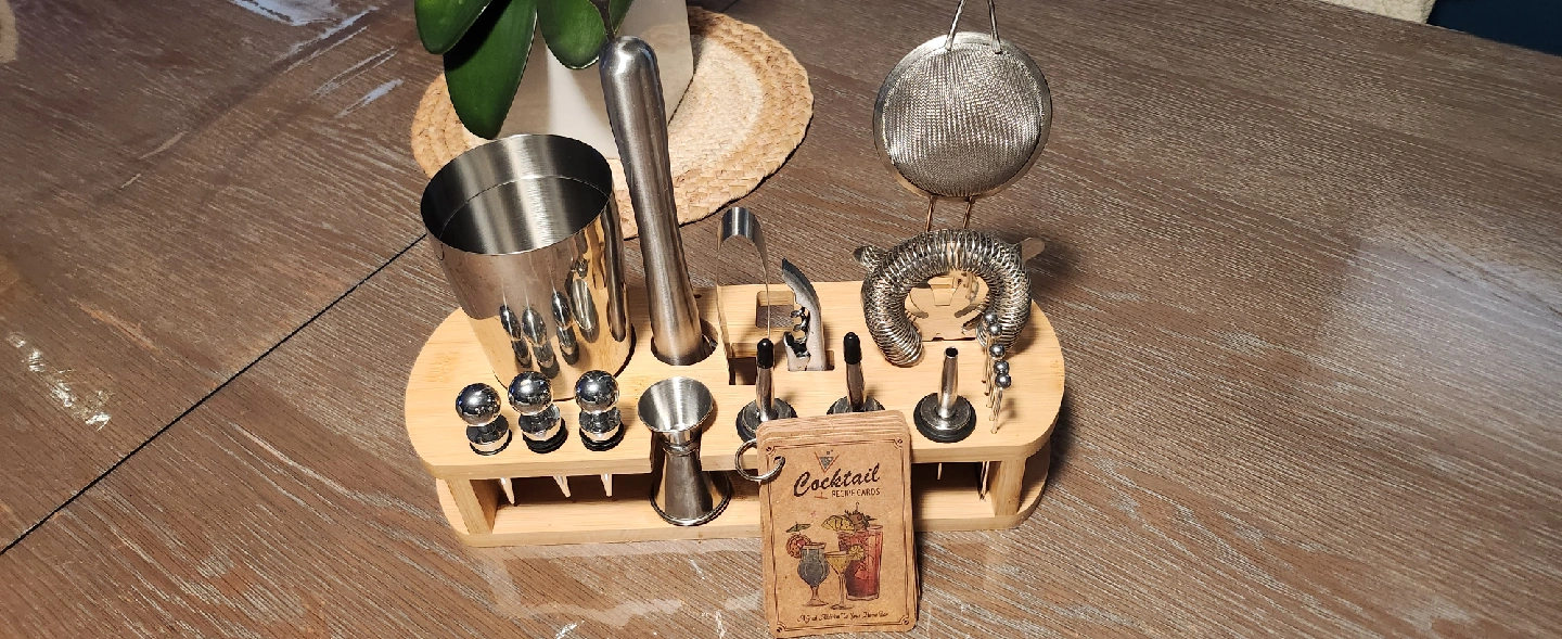 This is a cocktail shaker set, also known as a bartender kit. It includes various tools for mixing drinks and is displayed on a wooden stand. Perfect to make delicious drinks and beautiful to display.