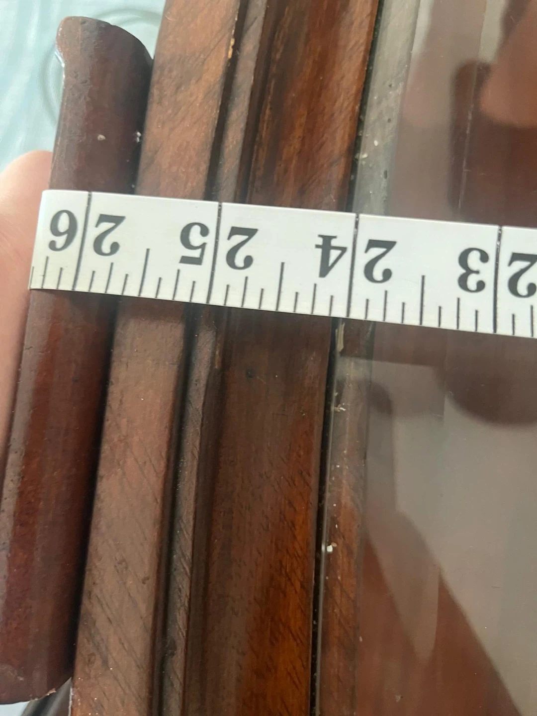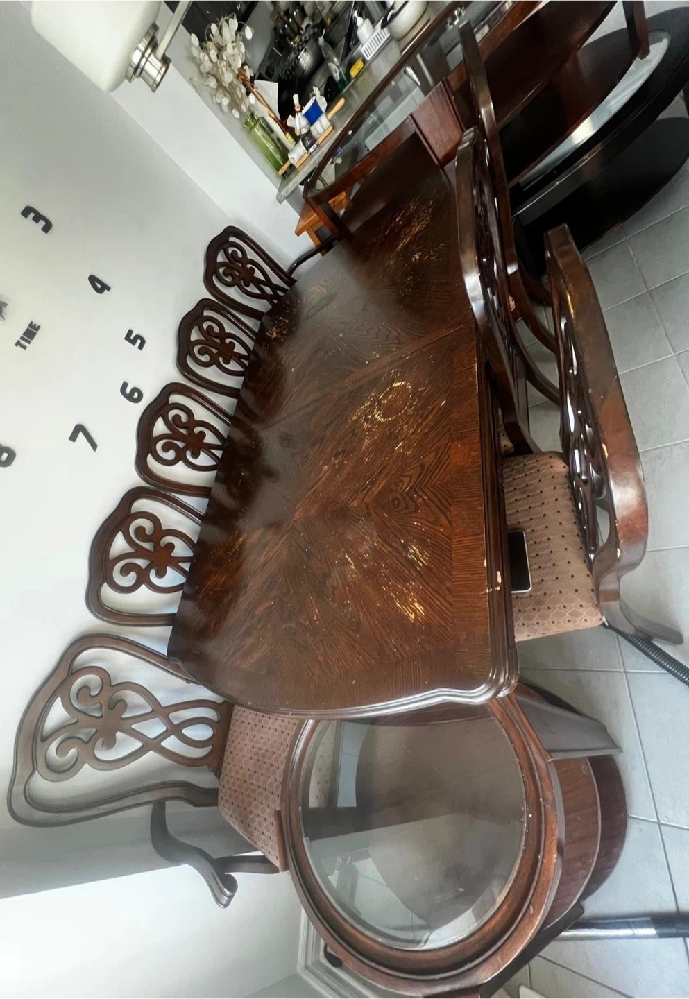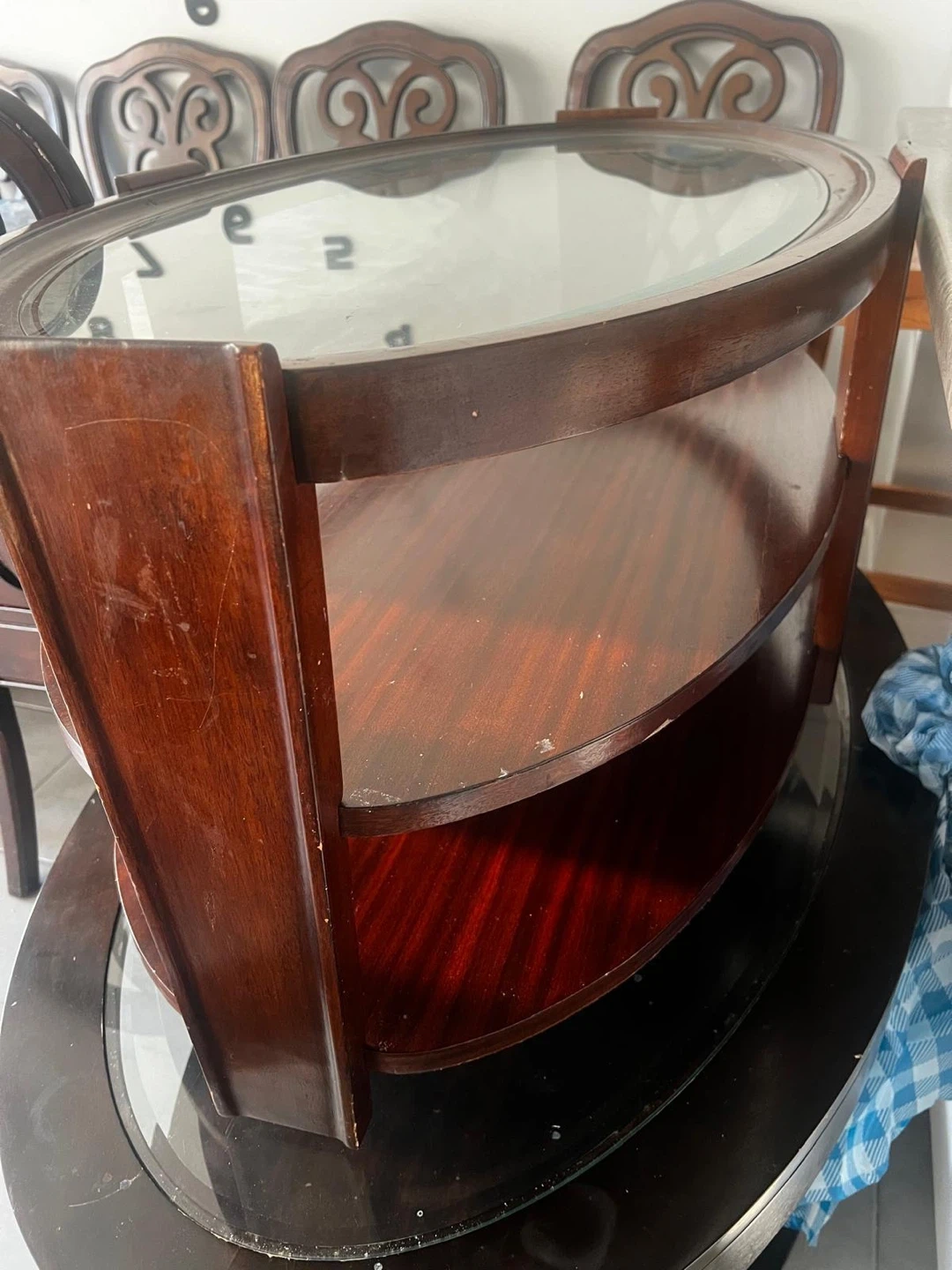 Selling a wooden dining table set with a glass-topped coffee table. The dining table comes with six chairs. The coffee table is round and has three tiers. There are some signs of wear and tear on the dining table.