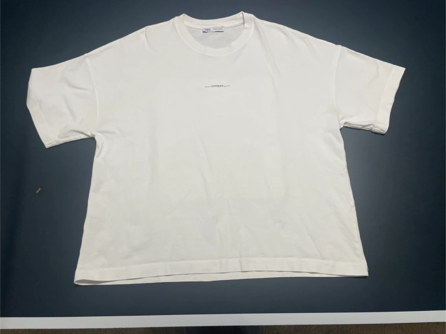 10Selling a Zara white T-shirt! It's in great condition and has a unique design on the back. Perfect for a casual look!