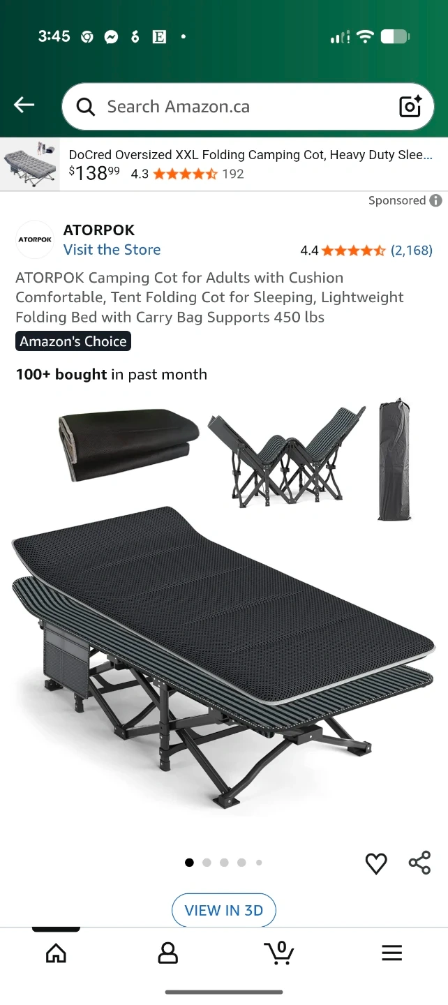 Selling an ATORPOK oversized XXL folding camping cot. It's in like-new condition and comes with its carry bag. It's lightweight and portable, making it perfect for camping or having an extra bed for guests. Supports up to 450 lbs.