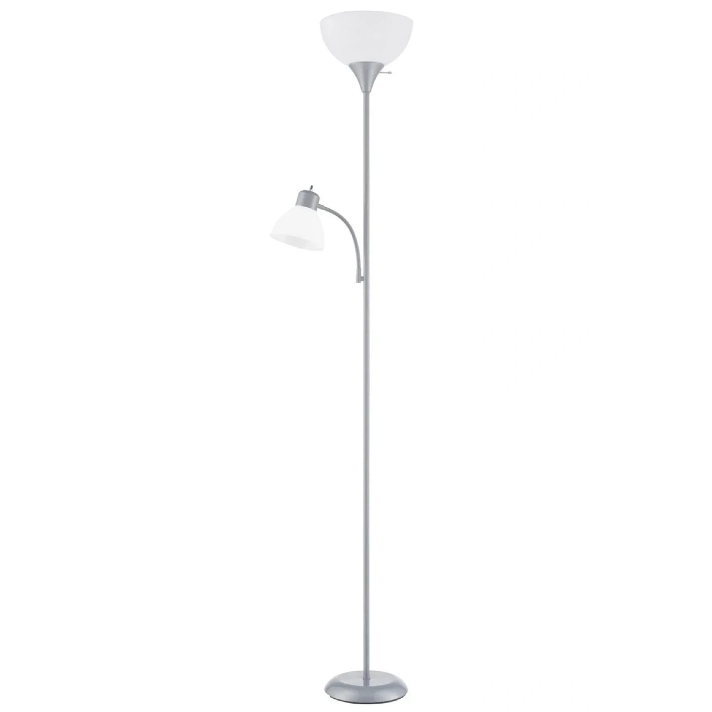 A floor lamp with an adjustable reading light, perfect for any room! It has a sleek silver finish that complements any decor. The lamp provides ample lighting for reading or general illumination. It's in great condition and ready to brighten up your space