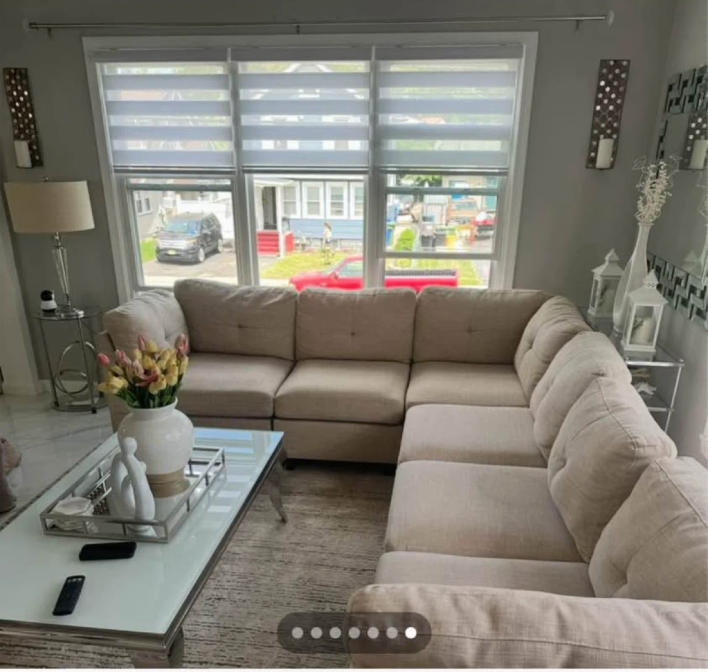 Selling a comfortable beige sectional sofa. It's in great condition and would be a perfect addition to any living room! The neutral color makes it easy to match with any decor. It's a great piece for relaxing and entertaining