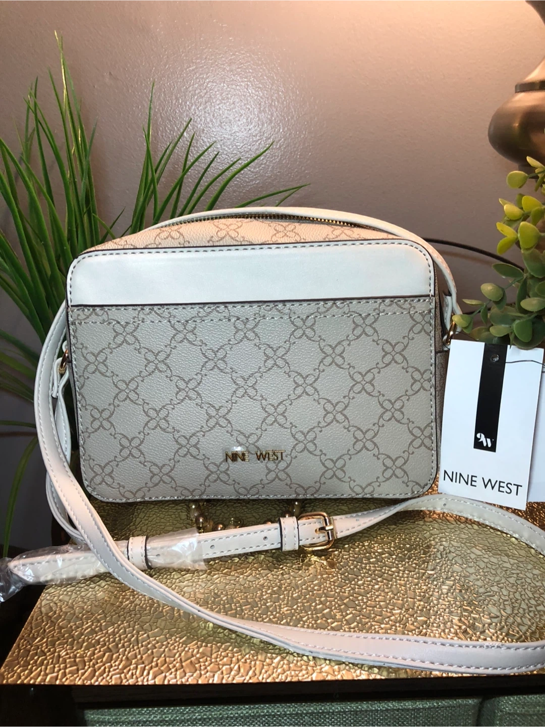 Nine West crossbody bag in a beige and white color scheme. It appears to be in good condition and has an adjustable strap. Perfect for everyday use!