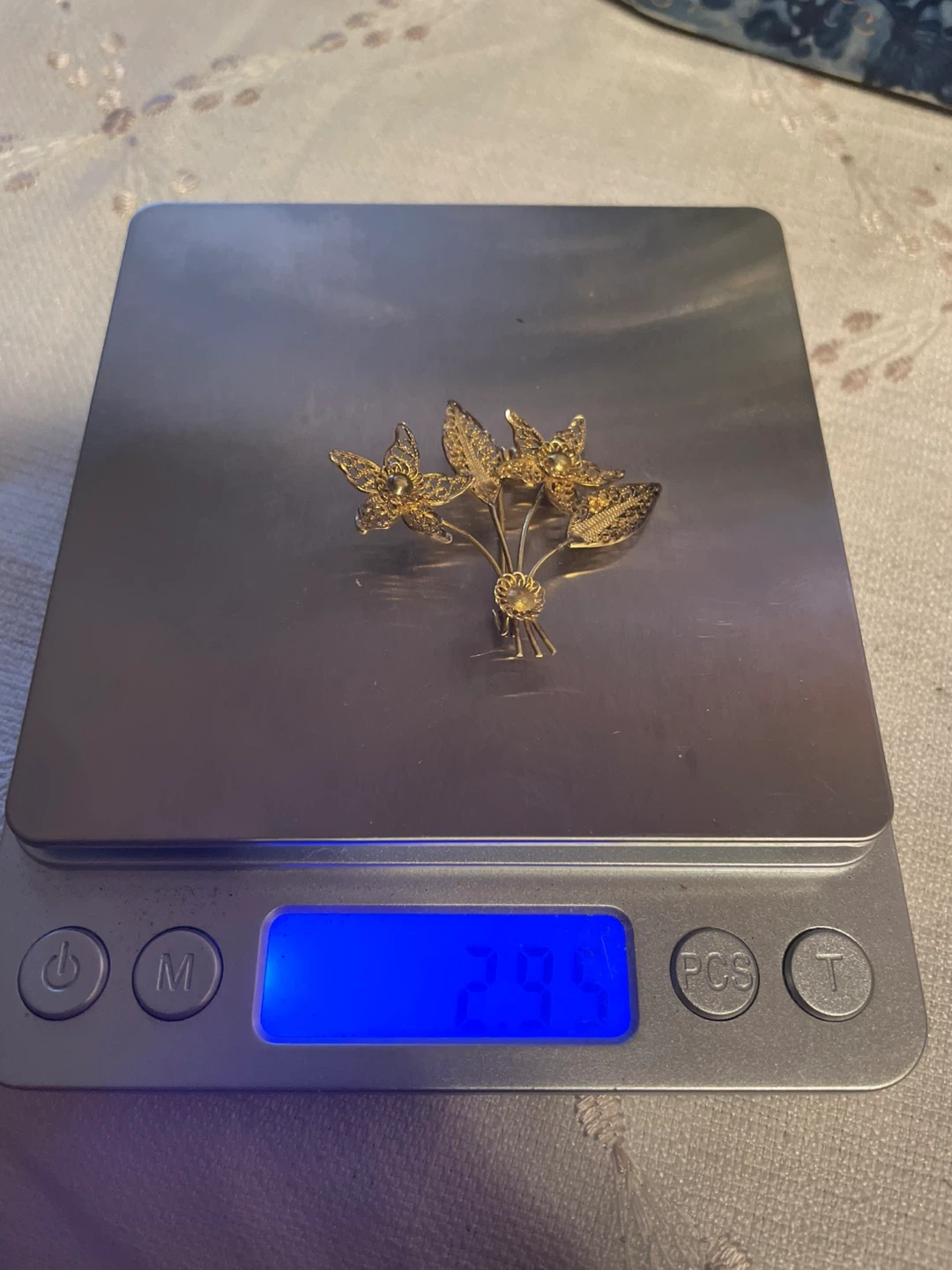 Selling a beautiful vintage gold flower brooch. It has a delicate filigree design and is in great condition. The brooch weighs 2.94 grams.