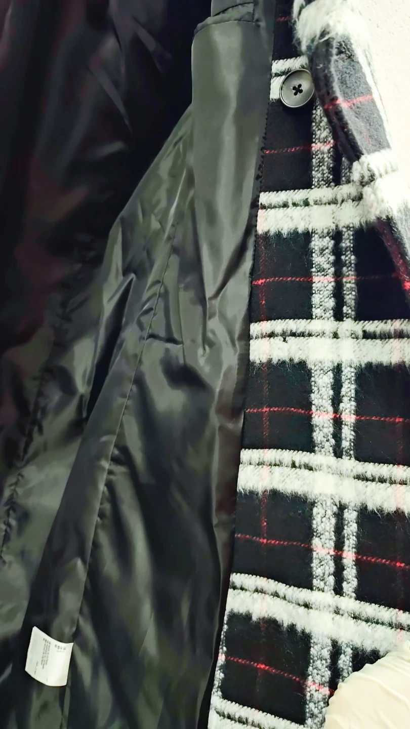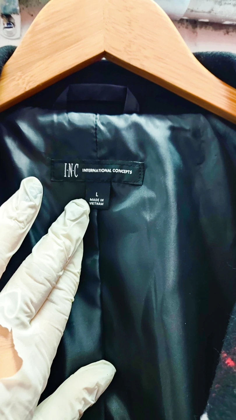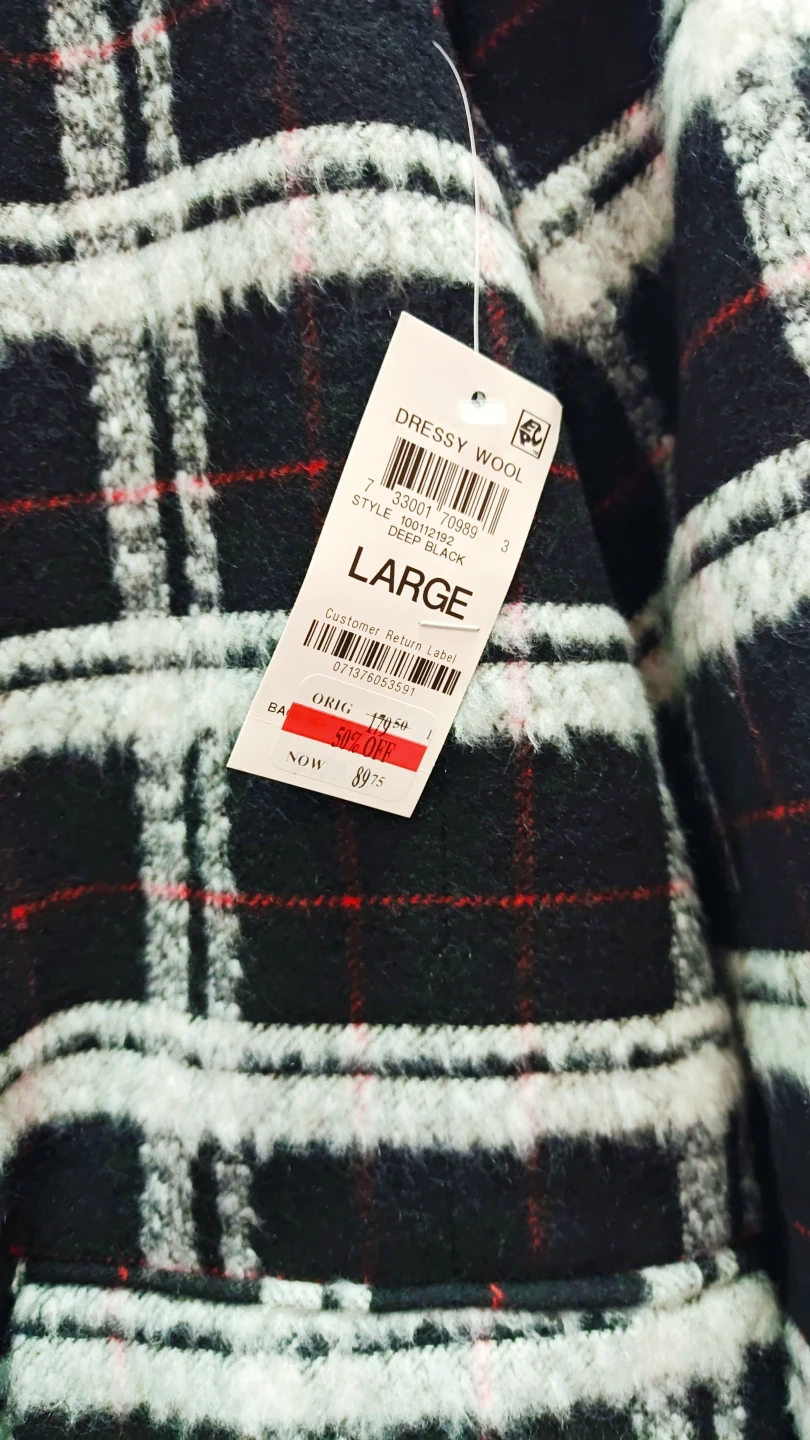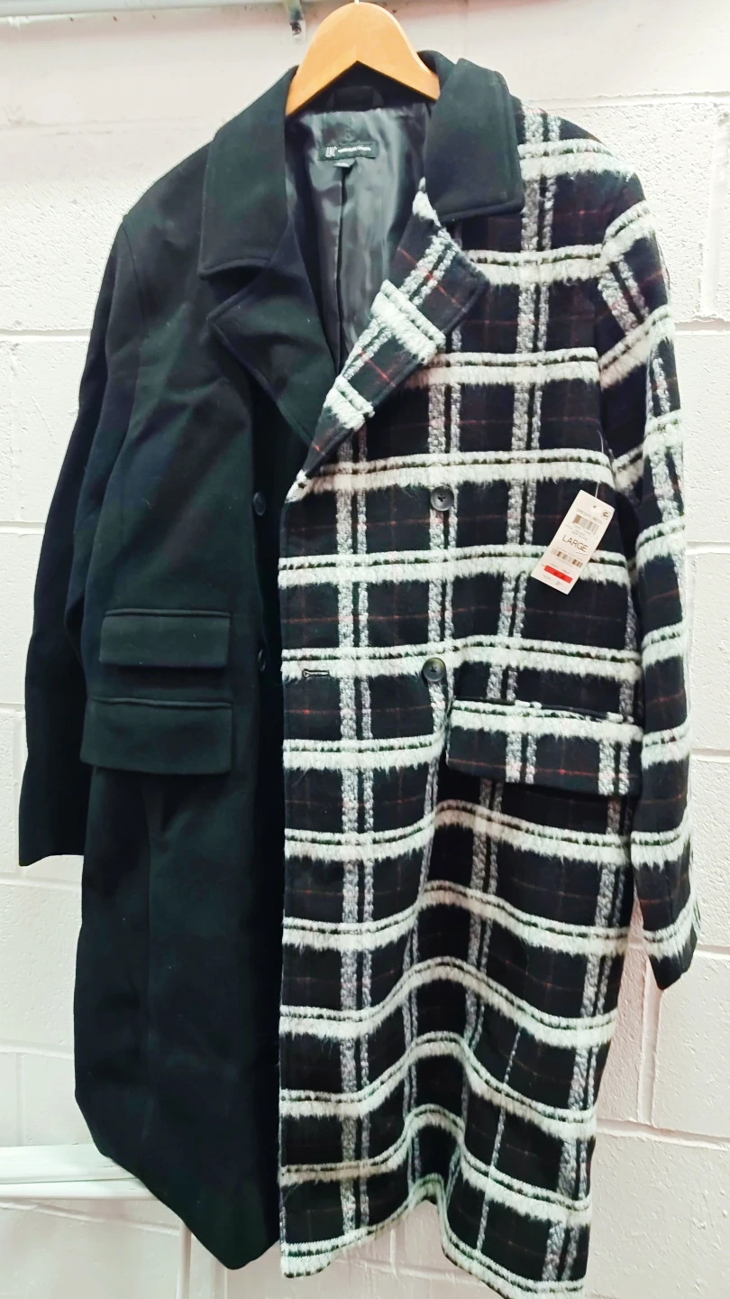 73Selling a stylish INC International Concepts coat! It's a dressy wool coat in size large. The coat features a unique deep black and white plaid design. Originally bought for $129.50!