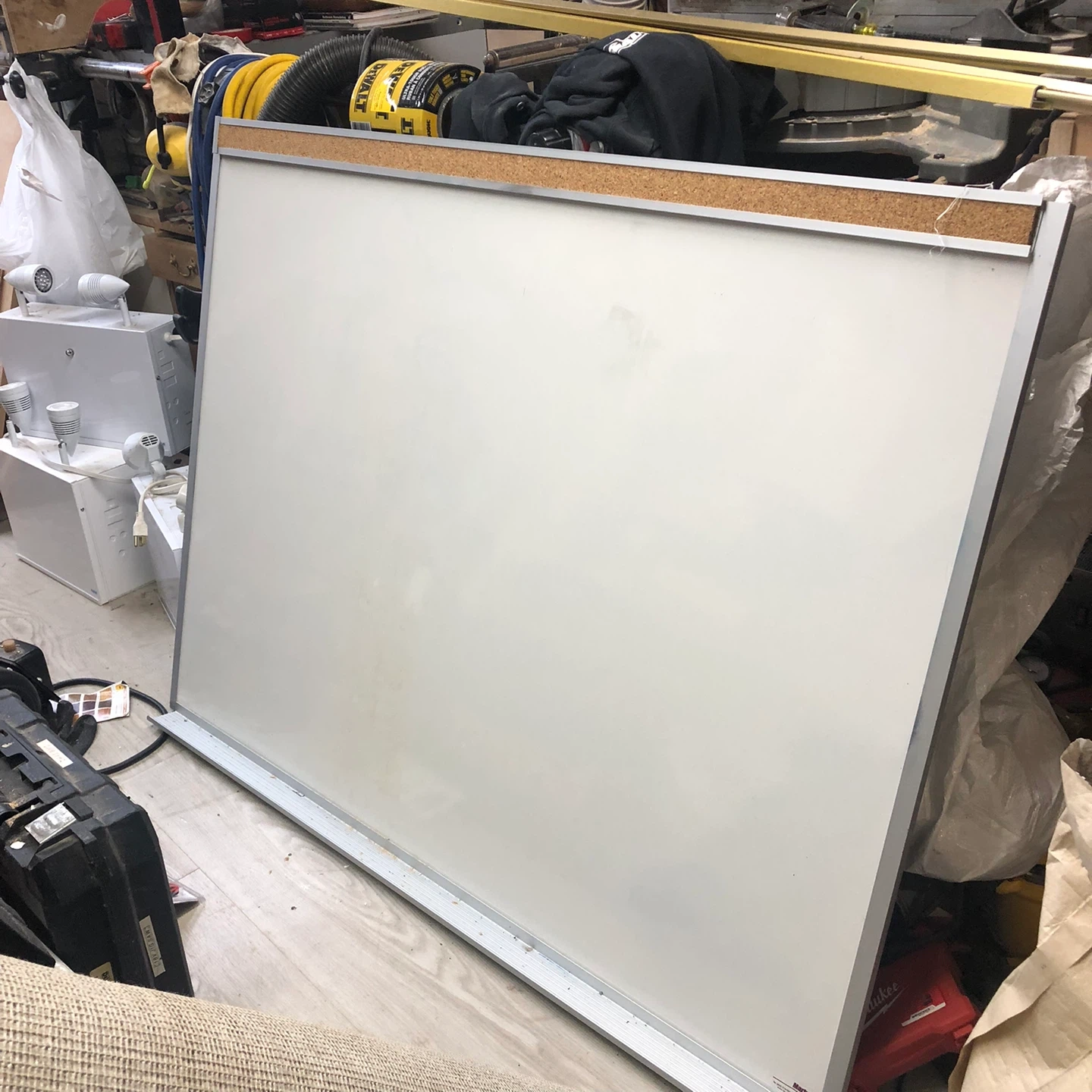 Selling a whiteboard with a corkboard border. It's in good condition and ready for a new home. Perfect for brainstorming or keeping track of your to-do list!