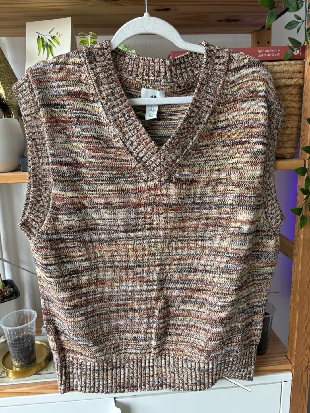 Cozy H&M knit vest in a relaxed fit! The tag indicates it's made of 100% cotton. It's a size small and features a V-neck design with a multi-coloured knit pattern.