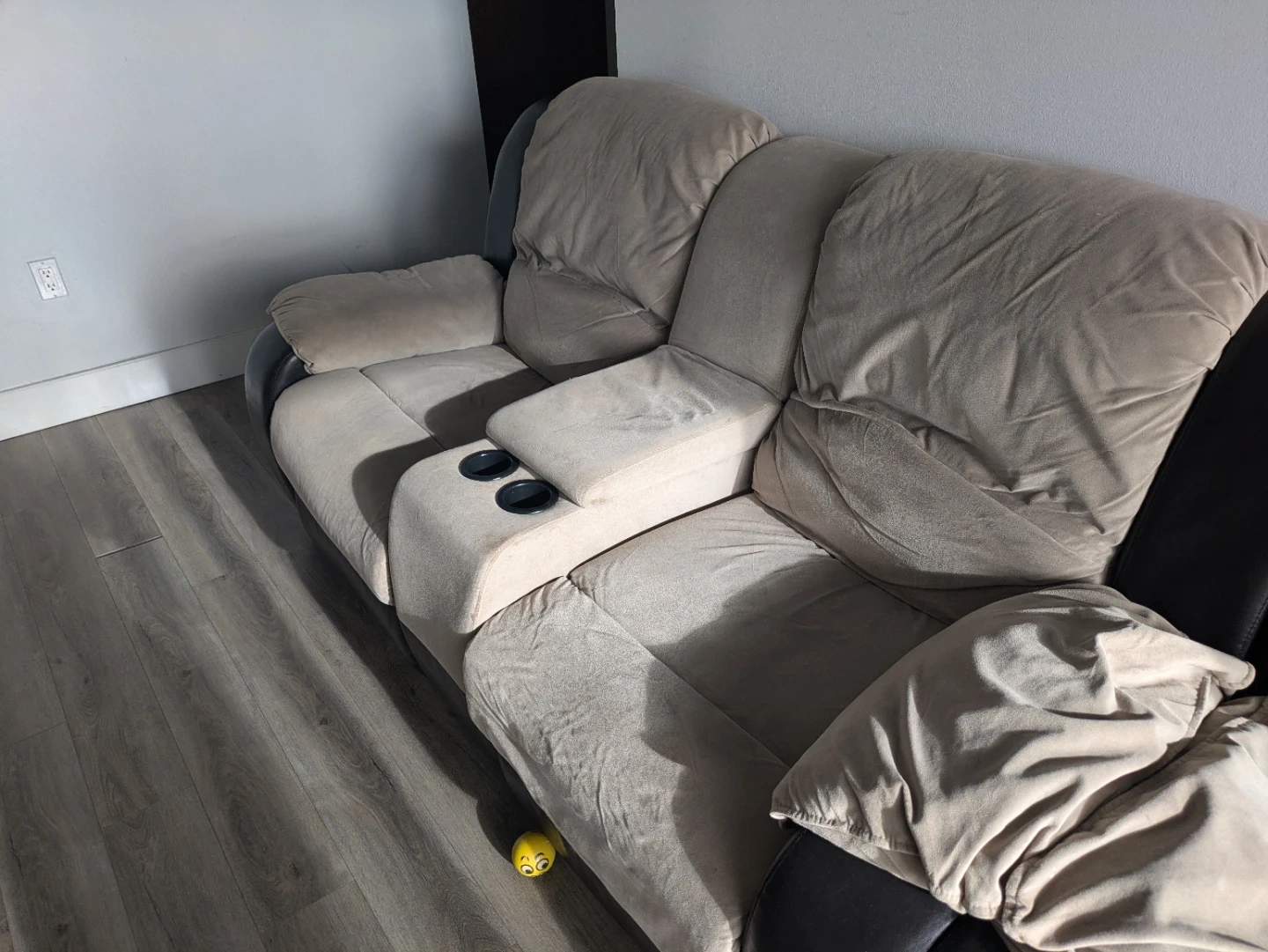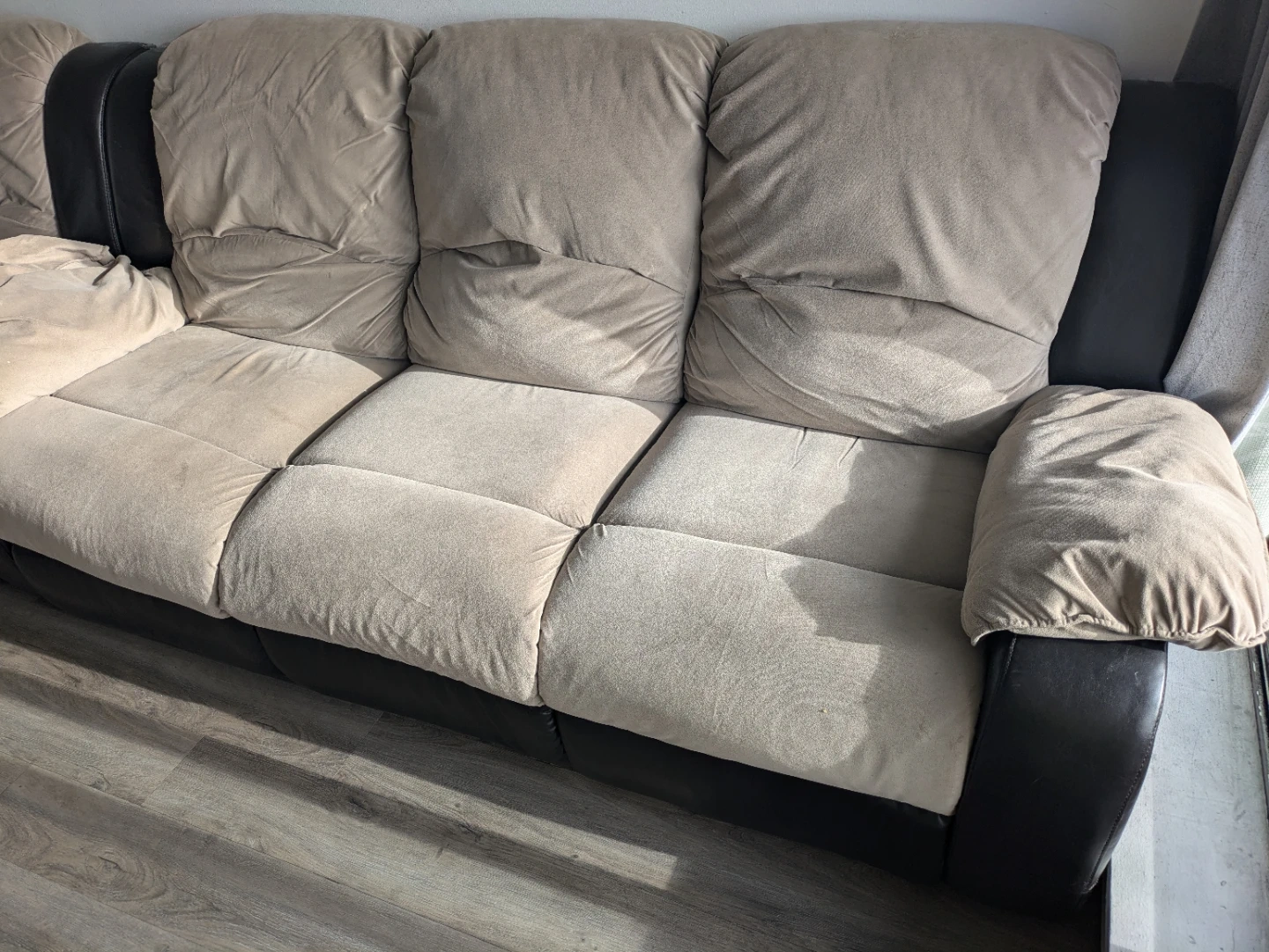 Selling a comfortable reclining sofa in beige and brown color. It's in good condition and ready for a new home! It features reclining seats for ultimate relaxation.