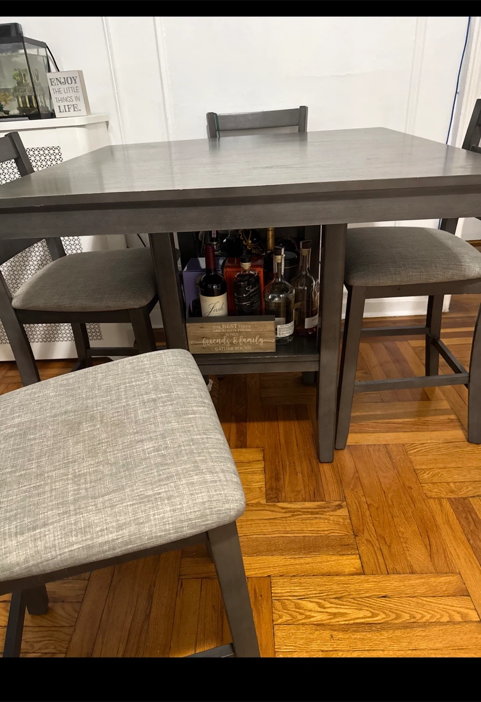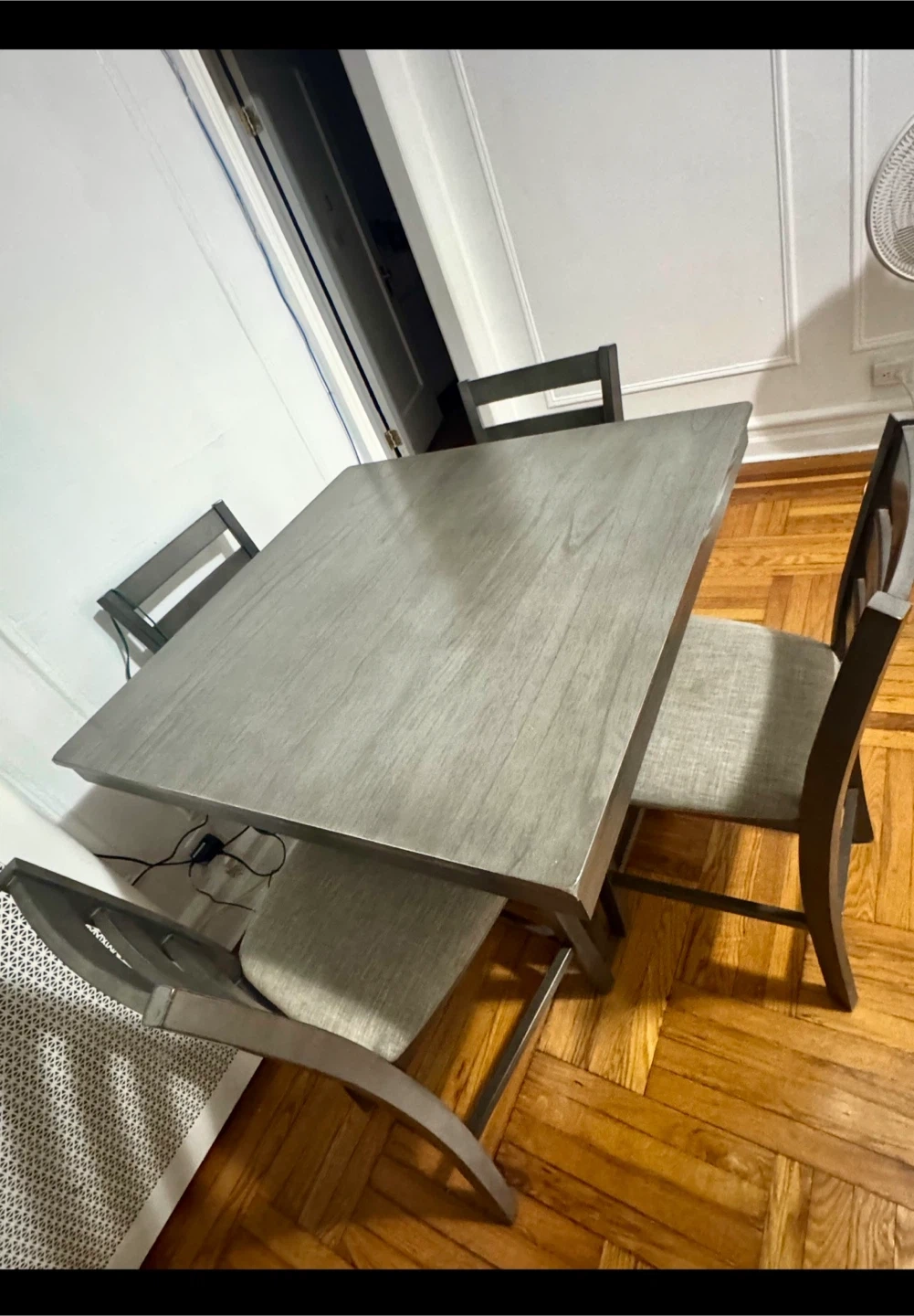 Selling a dining table set that includes a table and four chairs. The set is gray and would fit nicely in any dining room or kitchen. It's in good condition and ready for a new home!