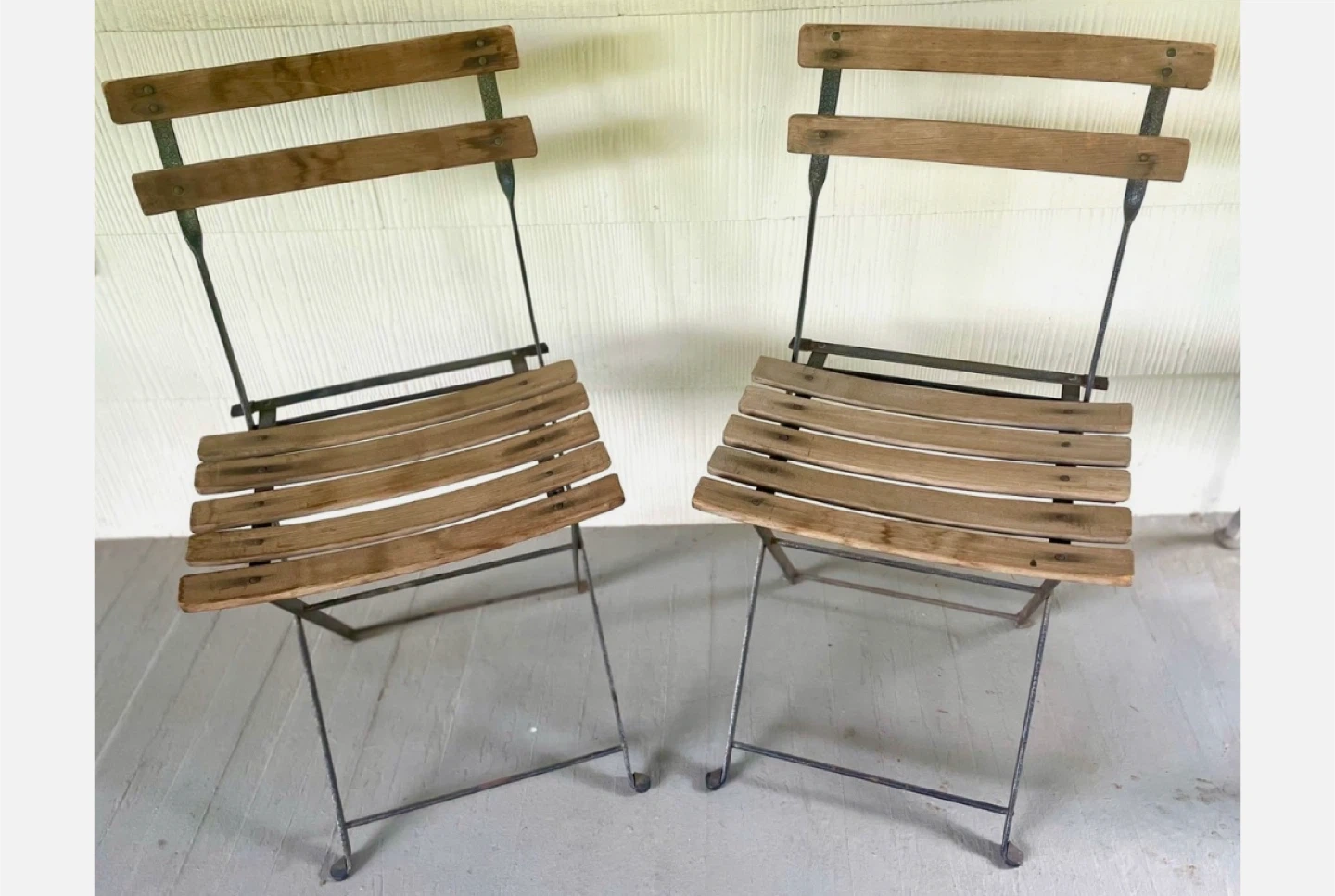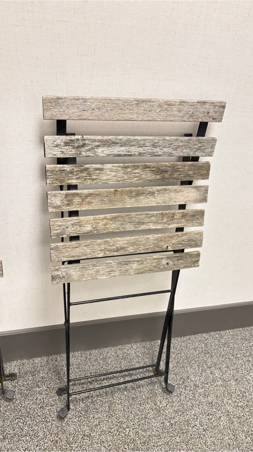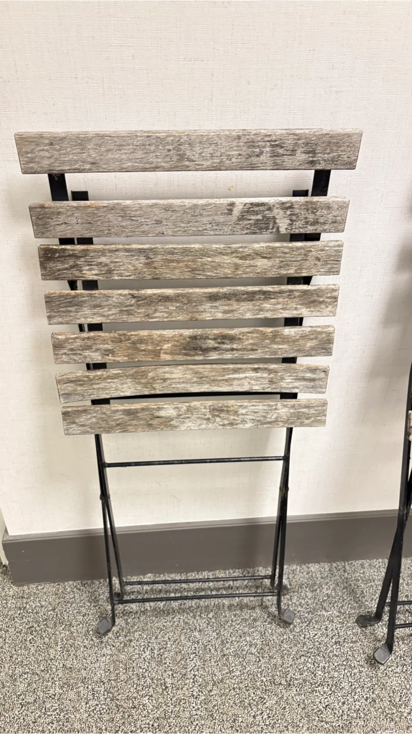 Selling a set of two folding bistro chairs. These chairs have a weathered wood finish and a black metal frame. They're perfect for a small balcony or patio, and easy to store when not in use