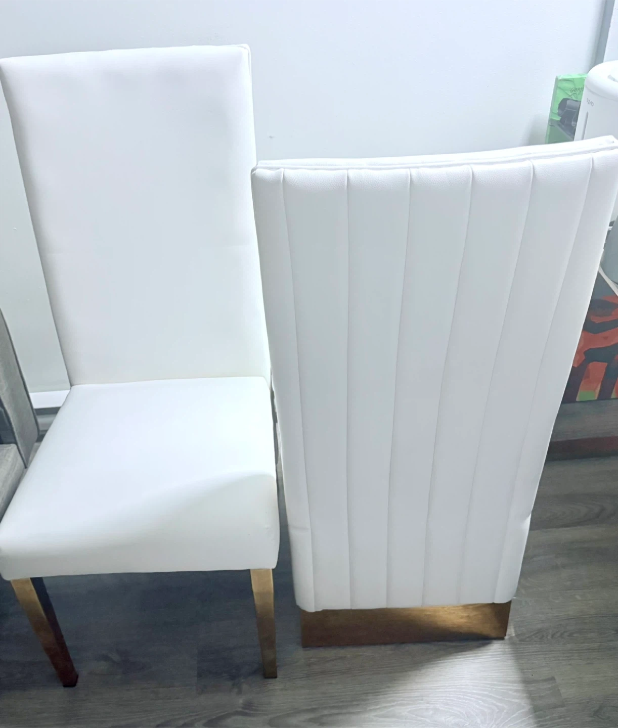 Selling a 4 piece set of stylish white dining chairs featuring sleek gold legs! One needs to be tightened more after being stored. They're in good condition and would look fantastic in any modern dining space. They also come with white chair covers.