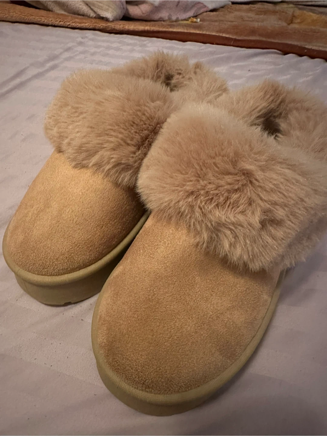 Selling a pair of cozy, fuzzy slippers in a lovely beige colour. They look super comfy and would be perfect for keeping your feet warm on chilly days