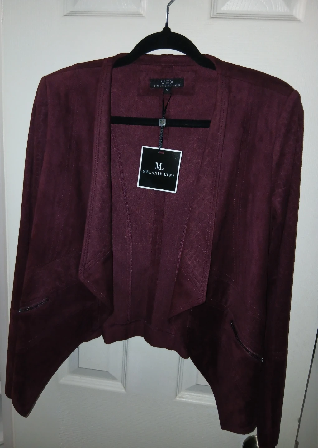 This is a Vex Collection blazer from Melanie Lyne in size 8. It's a beautiful burgundy colour and made with luxurious fabrics.