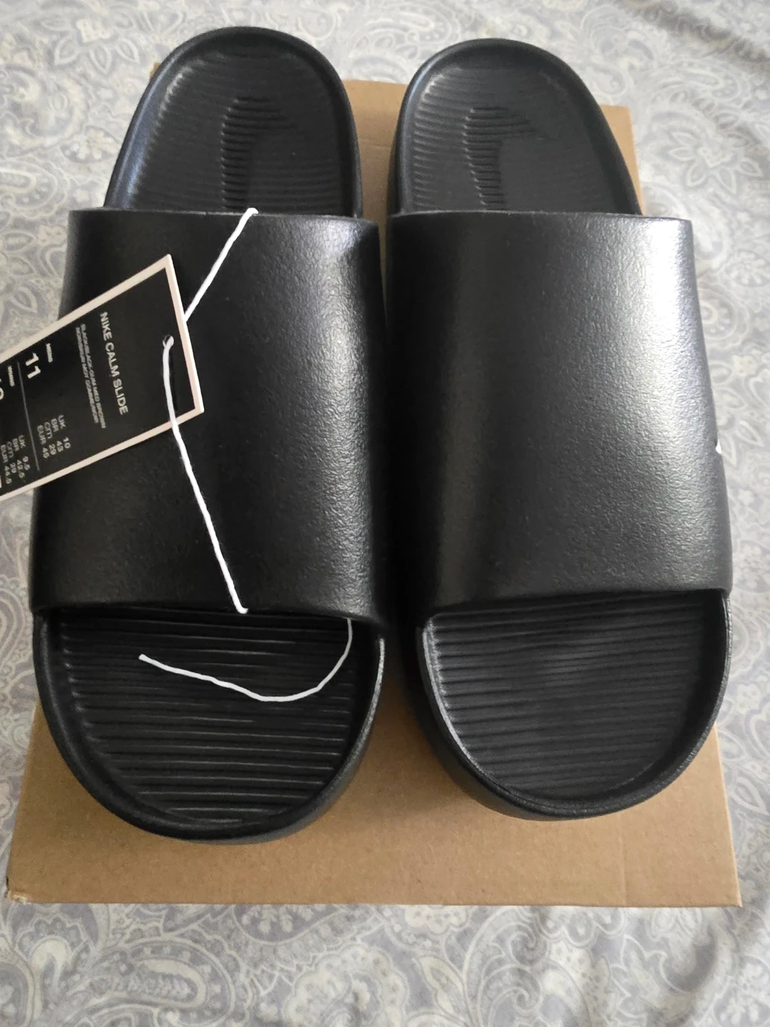 Selling a brand new pair of Nike Calm Slides in black, size 11! They come in the original box. These slides are super comfortable and perfect for everyday wear. The sole is a contrasting gum medium brown color. Grab them while they're here!