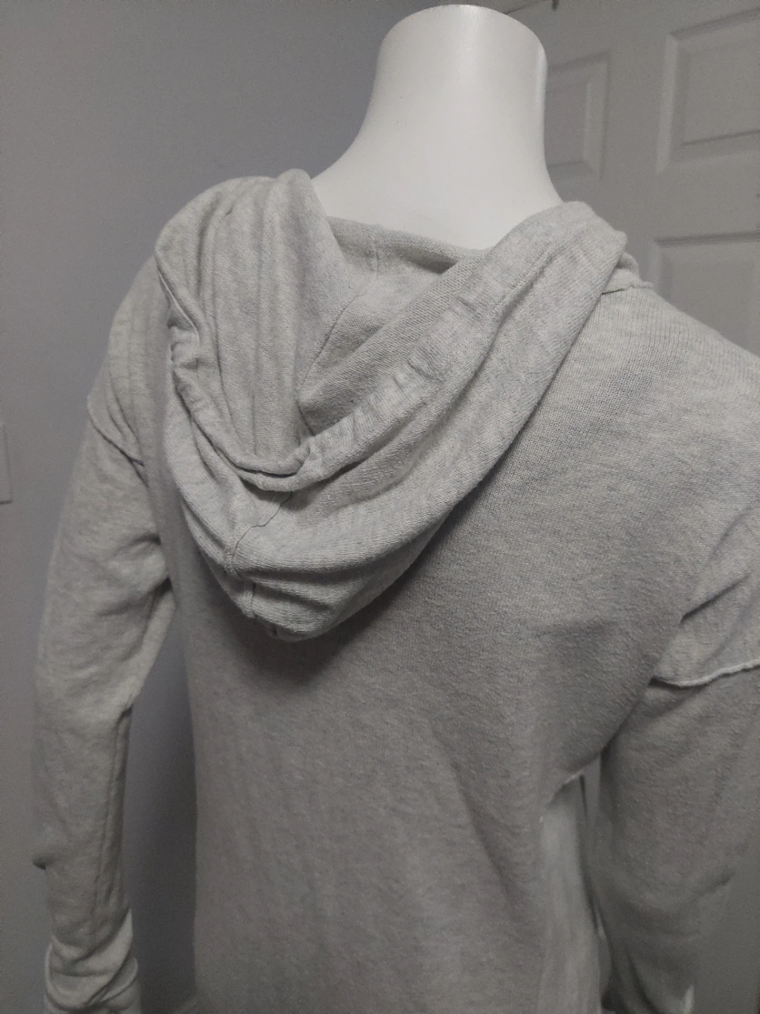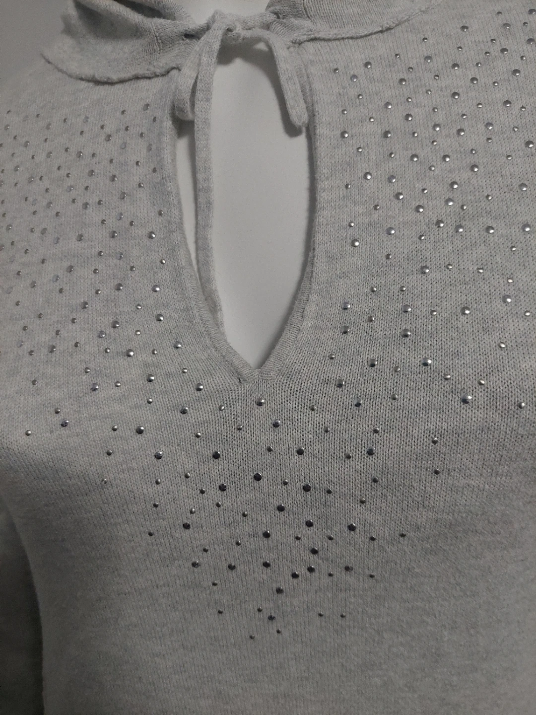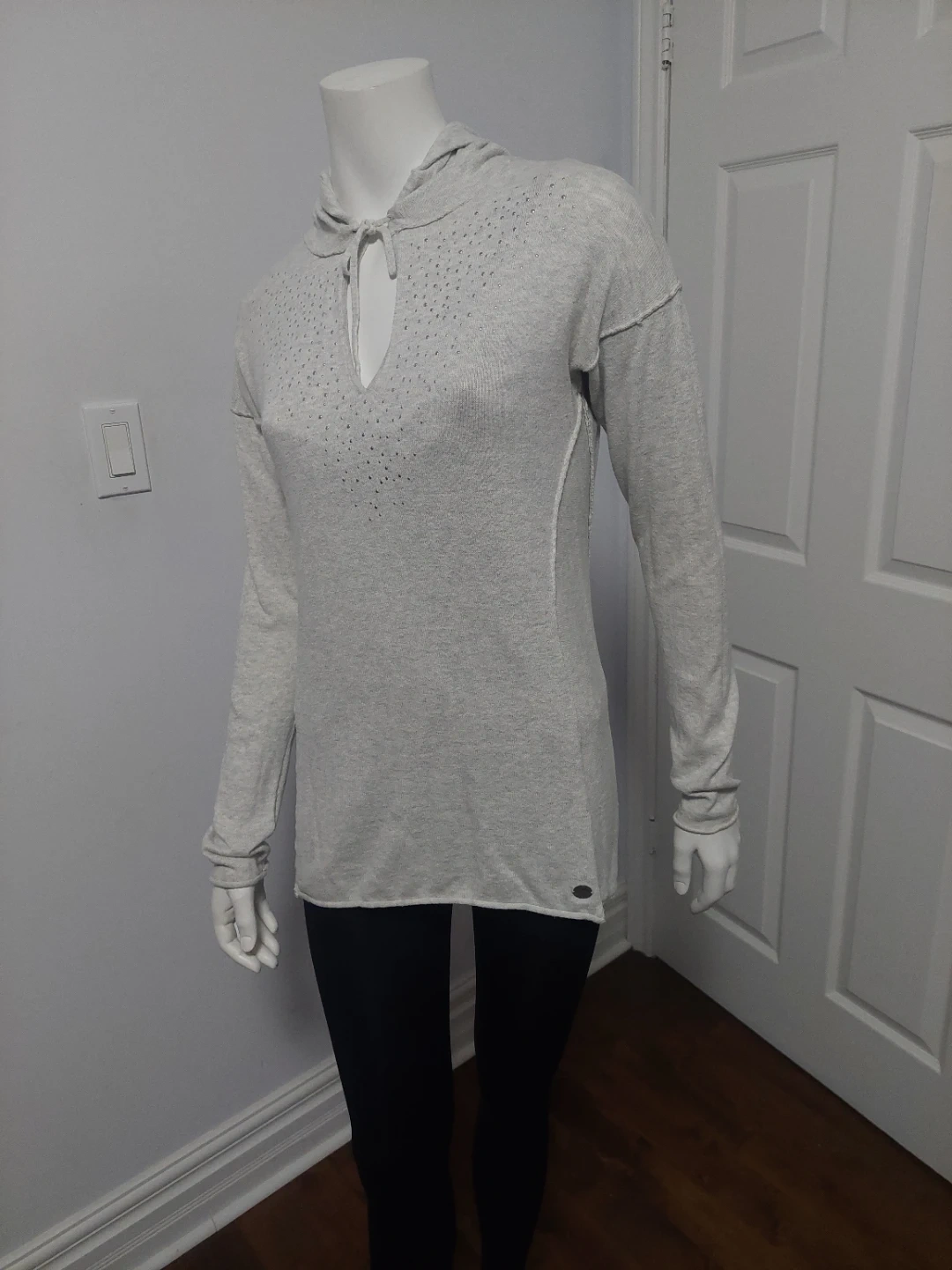 Cozy Calvin Klein cotton hoodie in size medium! It's a light grey colour and features a unique V-neck design with a hood and drawstring and sparkling embellishments at the chest.